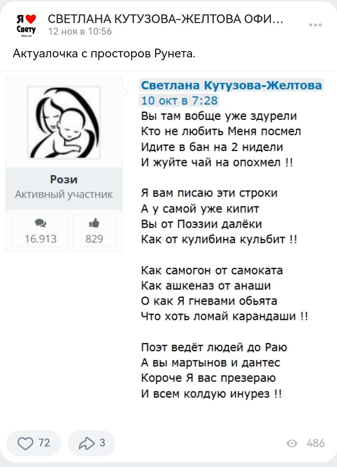 "Ты погоди не спеши, ты погоди не спеши"" Я сделаю разбор "Золота на голубом", но щас у меня полы, стирка и посуда. Готовьте марш Мендельсона на Стихи ЛИТ.РАЖ 14 окт 2023предложил Александр Гайдин Кто весь отчаяный на грани Верёвку с мылами не трож Любовь нечаяно нагрянит Когда её совсем не ждёш !! В нутри появится влеченье Глаза расширются вот так И вмиг настанит облигченье А то страдали как ***** !! Начнёте бриться умываться Что- б не сойти за поросят И будит вам пожизни 20 А не унылых 50 !! Я возношаюсь на зените И вам от тудова ору Любите гражданы любите А Я проверю по утру !! ☝️ Светлана Кутузова -Желтова Любви все возрасты по корны Ей все горят и стар и млад Который раз ужэ по вторно Или четвёртый раз подряд На помнил Светин стих всем людям И вы как я втори́те ей Чють чють щесливыми по будим А то какойто дуралей Сказал што нет любви на свете А есть лиш грусная печяль Он ни при слушывался к Свете И мне ево ужасно жаль Вот я люблю хоть ни в заимно Одну великую Поэт И заевляю лигитимно* В душэ́ моей звучит клорнэт Рояль труба и пианино Ну вобщем этот весь набор Душа с правляет Именины А в серце пламеный мотор!! О юноши с меня премер вы Берите тожэ прямо щас!! Любовь вам у спокоит нервы И перестает плакать глаз Купите жэнщинам букеты А ейным детям крембрюле Жывите по заветам Светы И станет Мир на всей Земле!! лигитимный* это вроде бы ни на нашэм означает правомочный а ещо прощще законный Саня Гайдин Яндекс — поиск по видео ЦЕЛОВАЮ БРАЦКИМ ЦЕЛОВАНИЕМ