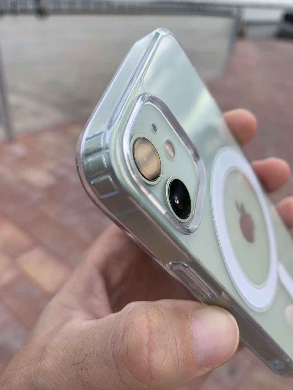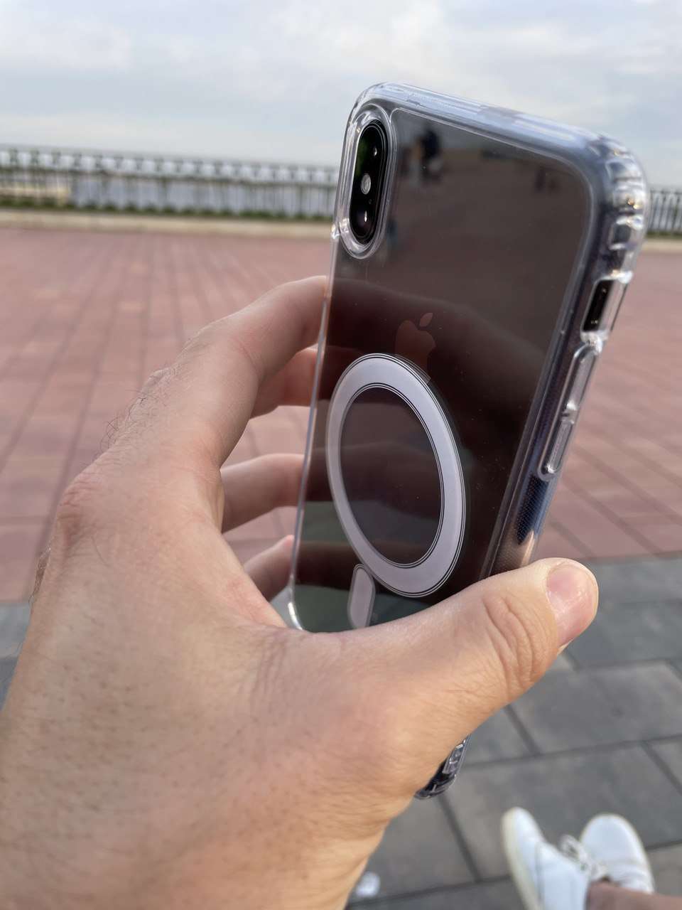 Если у вас айфон, который поддерживает беспроводную зарядку, то с простым чехлом она работать не будет. Для того, чтобы шёл заряд, нужен именно чехол с поддержкой magsafe — в него вшито кольцо и доп.секция. На фотографиях они под белым кругом и чёрточкой. Как верно отмечает Midea, на этот же чехол крепятся картхолдеры. Даже если у вас нет магнита в телефоне, с чехлом всё держится отлично. Выглядит так:
