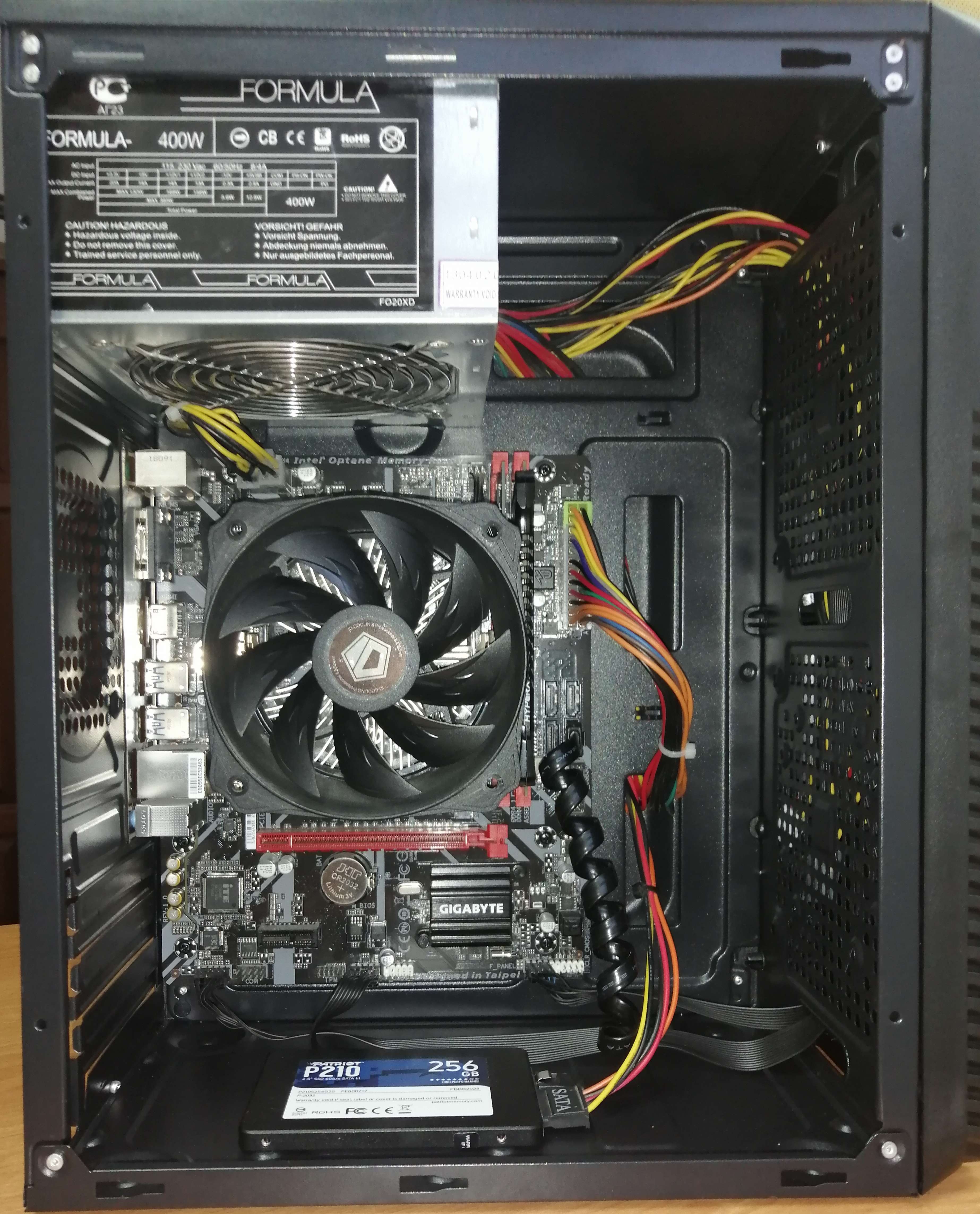 Материнка Gigabyte B360M H, разъём М2 Процессор Intel i3 8100 — 4 ядра по 3.6GHz Оперативка 12Gb DDR4: 4Gb Apacer 2400MHz + 8Gb HyperX Savage 2666MHz SSD Patriot 256 Gb Кулер ID-Cooling с вентилятором 120мм Блок питания — офисный Linkworld на 400 Ватт Корпус — miniATX абсолютно новый. Всё работало без нагрузок с графиком 40 часов в неделю. Цена - 14000.