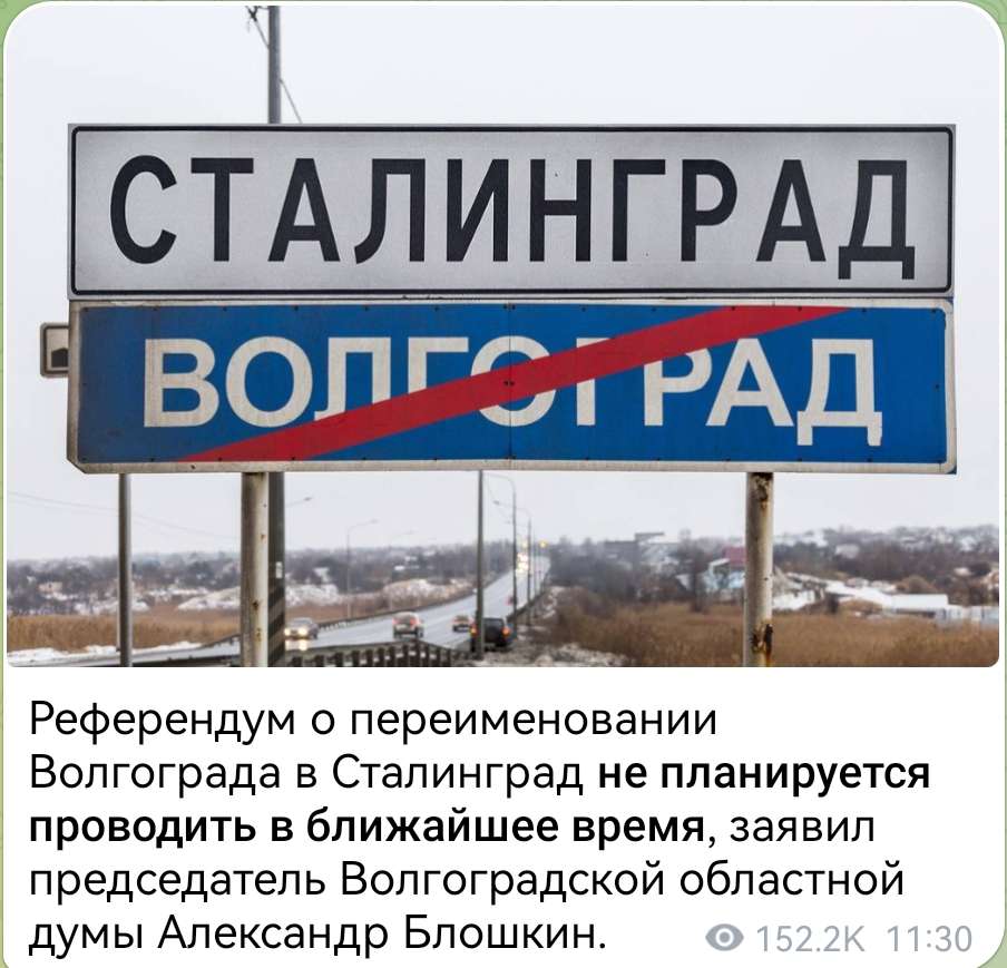 Только что завершил свою работу очередной пленум Совета ветеранов по переименованию. Выступление Блошкина радует своим оптимизмом, оказывается 70% за переименование. А ещё, оказывается, за те дни, в которые город переименовывают в Сталинград. Ну на 2 февраля, на 22 июня, на 19 ноября и прочие даты ... В городе оказывается происходит неимоверный подъём производства, куры показывают необъяснимый прирост удоя молока, а коровы несутся по 3 раза в день !!! Падает преступность и квартирные кражи ... Блин, откуда они это берут ... Я аж начинаю думать может у нас 2 Волгограда и я просто живу не в том Волгограде !? Так же неоднократно было сказано, всё будет только по закону, а закон - это референдум жителей Ну да, мы помним ... А, ну и самое оптимистичное, так как нет пока чётких указаний (!), общественный совет будет продолжать опросы до ноября 2024 года !