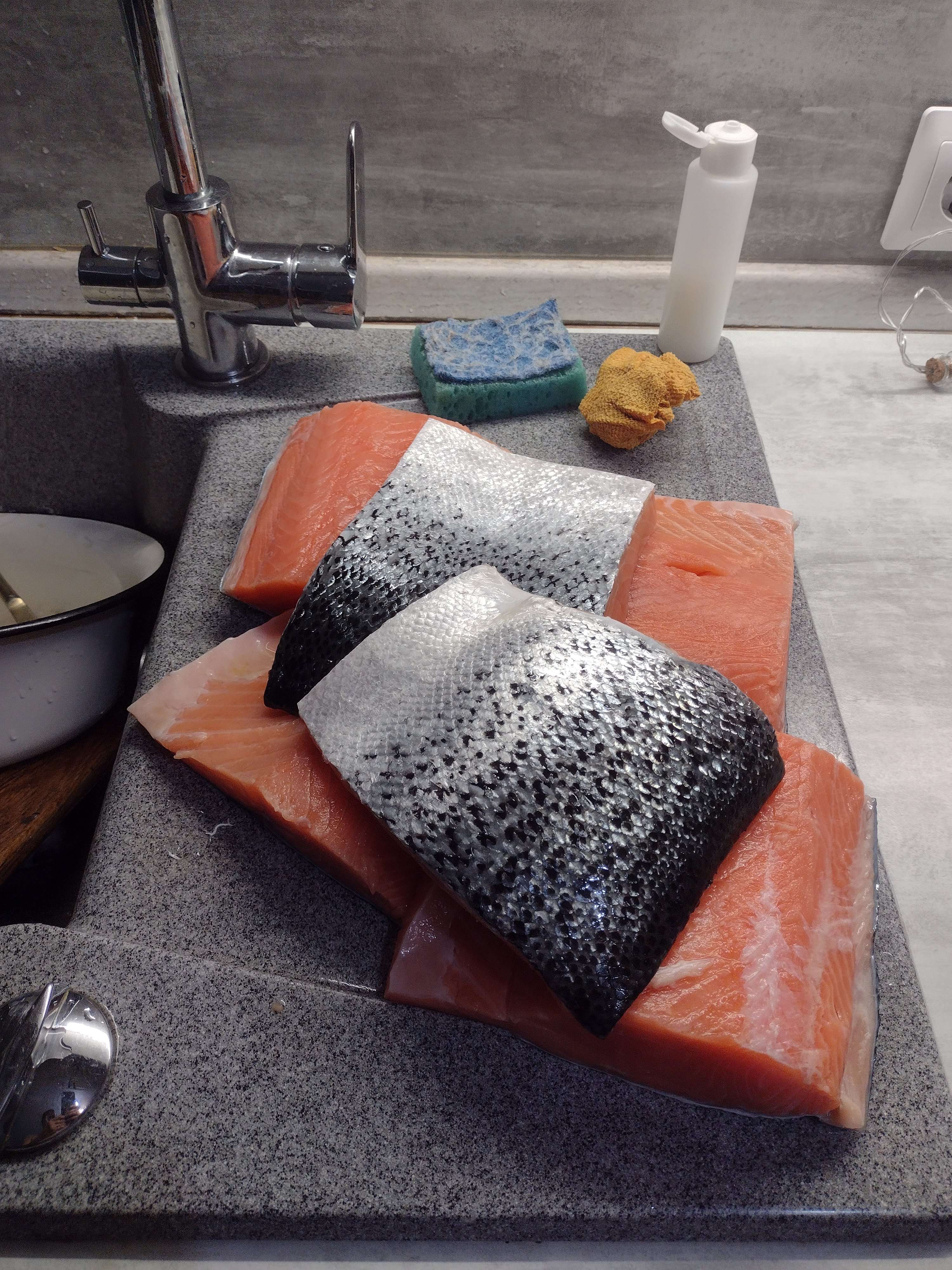 в Ашане сегодня стейки были по 1600, хорошие, большие. Половины лосося (со стороны хвоста) по 1200. Вроде норм. Судя по всему, шикарные стейки и были нарезаны из других половин этих же лососей. Остальное либо разобрали, либо не очень по внешнему виду.