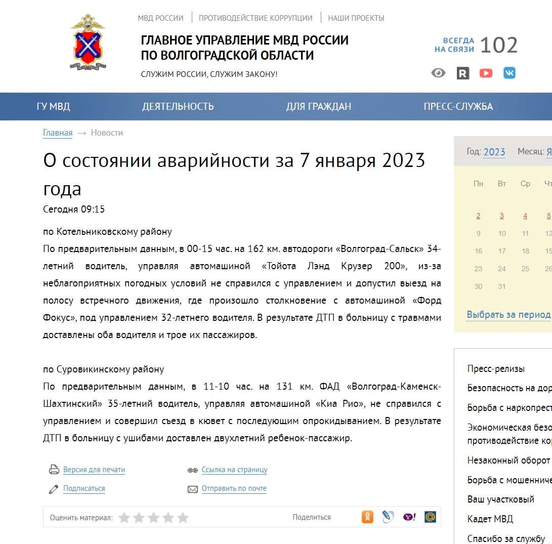 https://v1.ru/text/incidents/2023/01/08/71956805/ О состоянии аварийности за 7 января 2023 года Очень интересная формулировка: "из-за неблагоприятных погодных условий не справился с управлением и допустил выезд на полосу встречного движения". Кто же за рулем Крузера был то? В ЛЮБОЙ другой подобной ситуации формулировка от ГИБДД была бы "не выбрал безопасную скорость движения, не учел дорожные условия, вследствие чего, допустил выезд на встречную полосу движения". Именно так ВСЕГДА ГИБДД дает свои релизы в таких авариях и пишет в протоколах (их кучи и кучи гуглится https://orbita96.ru/news/detail/?ID=2826 Свердловская полиция устанавливает обстоятельства ДТП с тремя пострадавшими на 31 км автодороги Нижний Тагил - Нижняя Салда https://rossoshansky.vrn.sudrf.ru/modules.php?name=press_dep&op=1&did=1345 https://www.yamal.kp.ru/online/news/3447822/ http://4-ka.com/областной-анализ-ддтт/ и т.д.), именно такая формулировка потом в решениях судов. "из-за неблагоприятных погодных условий не справился с управлением и допустил выезд на полосу встречного движения" - это впервые вижу. И, более того, не гуглится такая формулировка на просторах интернета. И в решениях судов нет такого. Кто за рулем то был? И не боится наша ГИБДД создать опасный прецедент (для ГИБДД и дорожников, прежде всего) с ТАКОЙ формулировкой-то? Более того, по тому же самому адресу о сводках о ДТП за 7 января от ГУ МВД по Волгоградской области https://34.xn--b1aew.xn--p1ai/новости/item/34861649 в следующем же ДТП за то же 7 января, которое произошло чуть-чуть позже, формулировка уже более обычная - "не справился с управлением, совершил съезд в кювет" - и никаких тебе отсылок к "неблагоприятным погодным условиям", почему? тем более абзацем выше такая отсылка есть? Правда во втором случае всего лишь Киа Рио, а не ЛК 200 с неизвестным водителем...