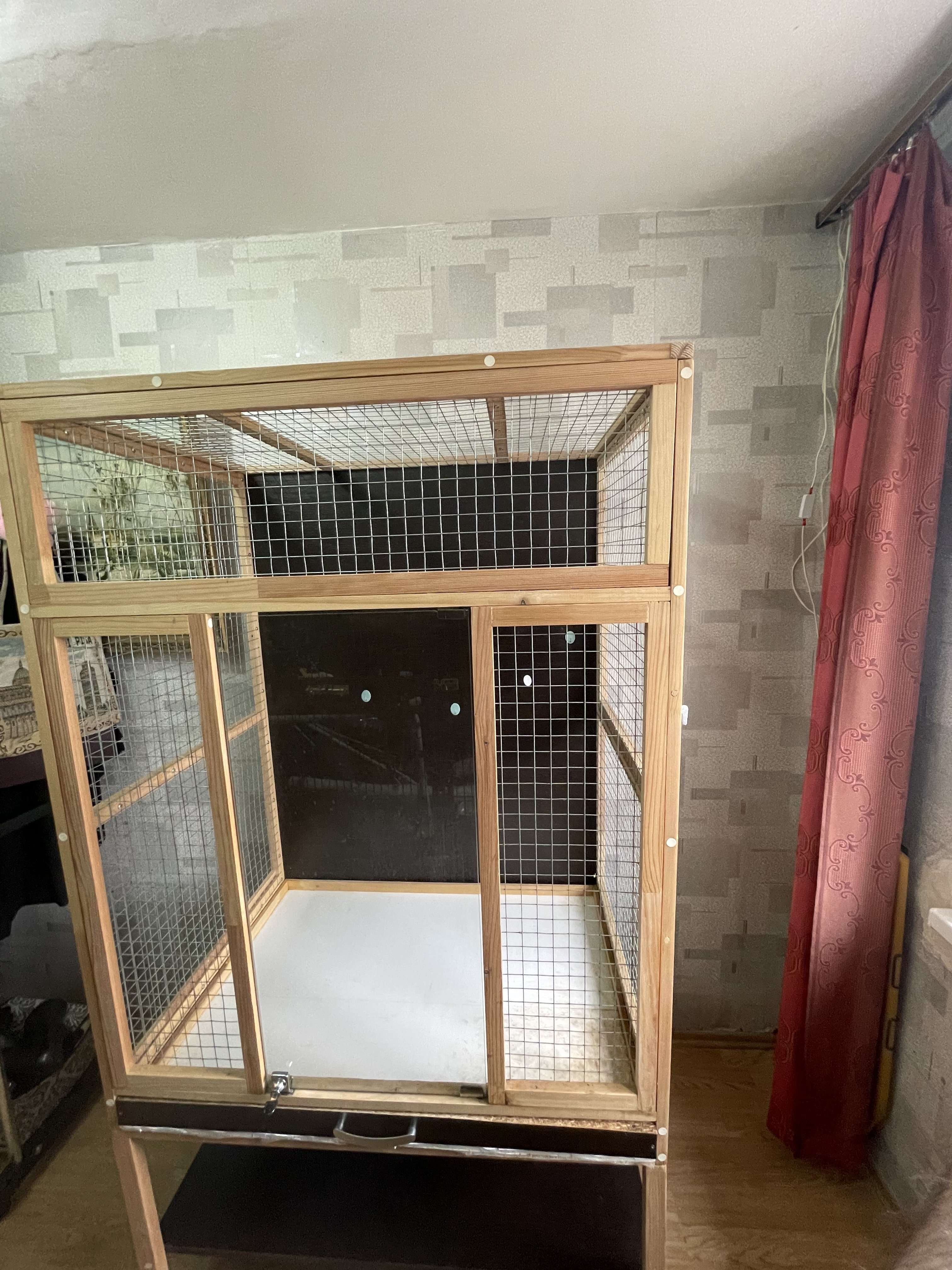 Ширина 100 см, глубина 70, высота с ножками 180, высота самой клетки 120, замок с ключом, ножки регулируются по высоте для установки по уровню. С правой стороны дверка на замке. Фронтальная дверка - стекло с замком на ключе. Полка из мдф на нижнем ярусе. Жили попугаи, переехали в новый вольер.