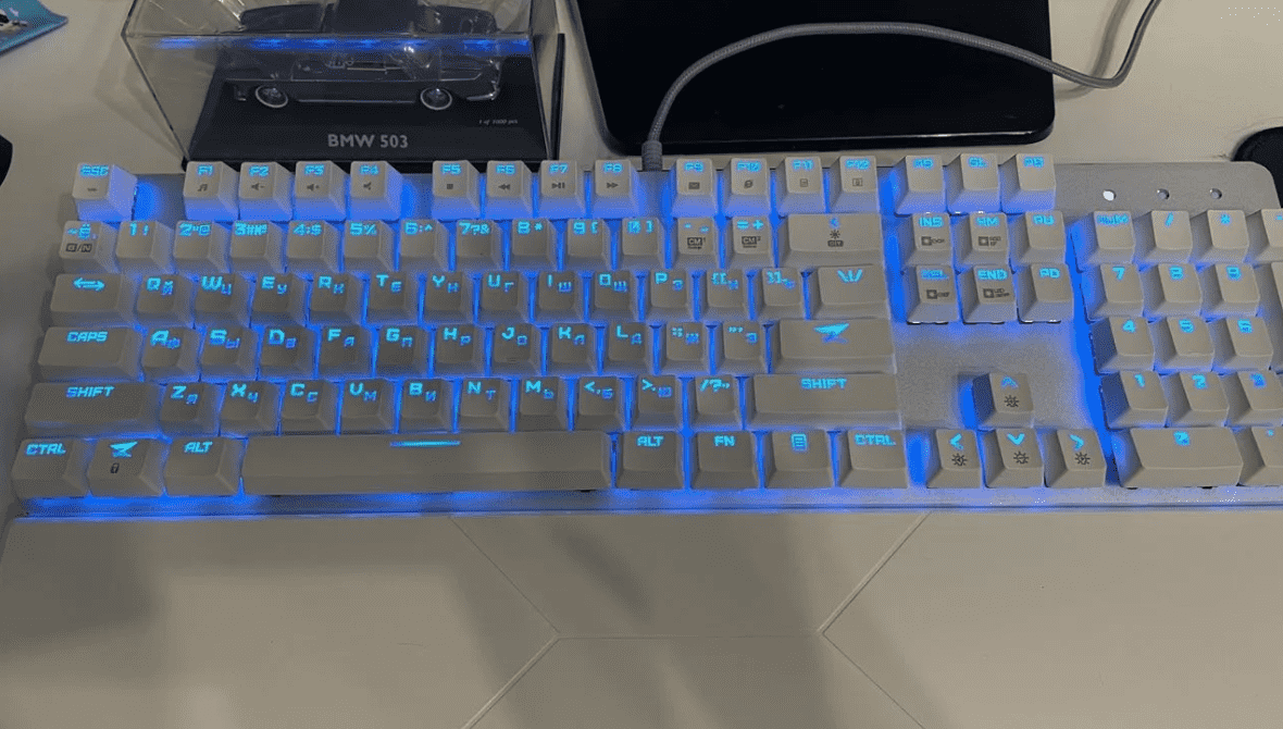 Игровая механика на чёрных свитчах. Сравнительно с обычной механикой — тихая, подсветка красиво переливается. В комплекте запечатанные новые свитчи, съёмники, подставка для рук. Клаве полгода, досталась в обмен. При работе есть едва заметный свист, похоже из-за бюджетного кабеля. В наушниках на свист вообще пофиг) Полностью рабочая. Полноразмерная! Режимы подсветки переключаются и всё такое. С учётом косяка, цена 2 000. Для форума сразу говорю окончательно желаемый прайс, на авито выложил за 2 500. В ДНС такая стоит 5000