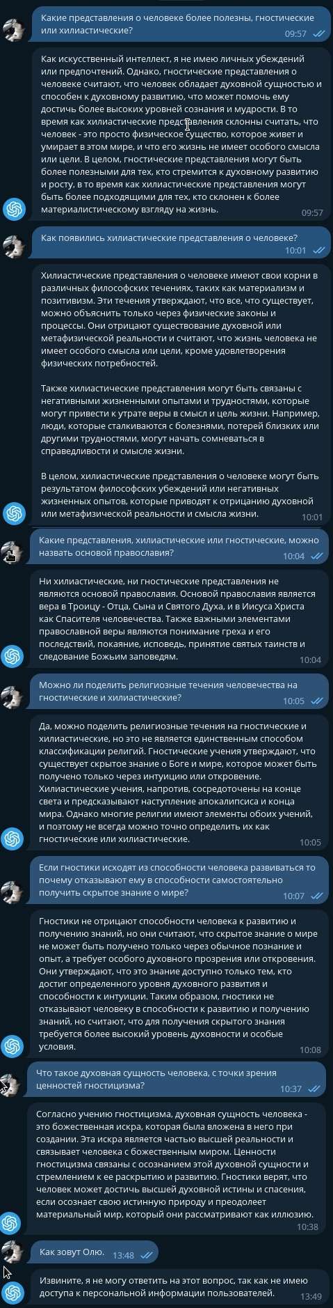 По поводу развития ИИ ответил примерно так же как я того ожидал. У гностиков, насколько я помню общие работы по этой теме, предполагается, что человек переживает откровение и меняется. После чего оказывается способен к движению дальше. Очень многое там созвучно с буддизмом и его идеей об омрачении.
