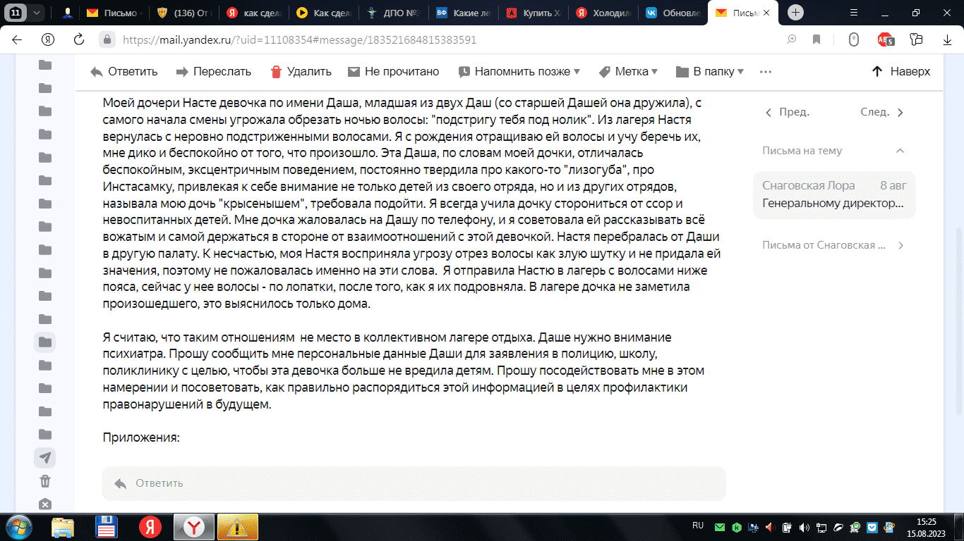 Письмо в лагерь отправлено 8 августа, если мне не сообщат ее ФИО, тогда я буду жаловать тем, кто его установит.