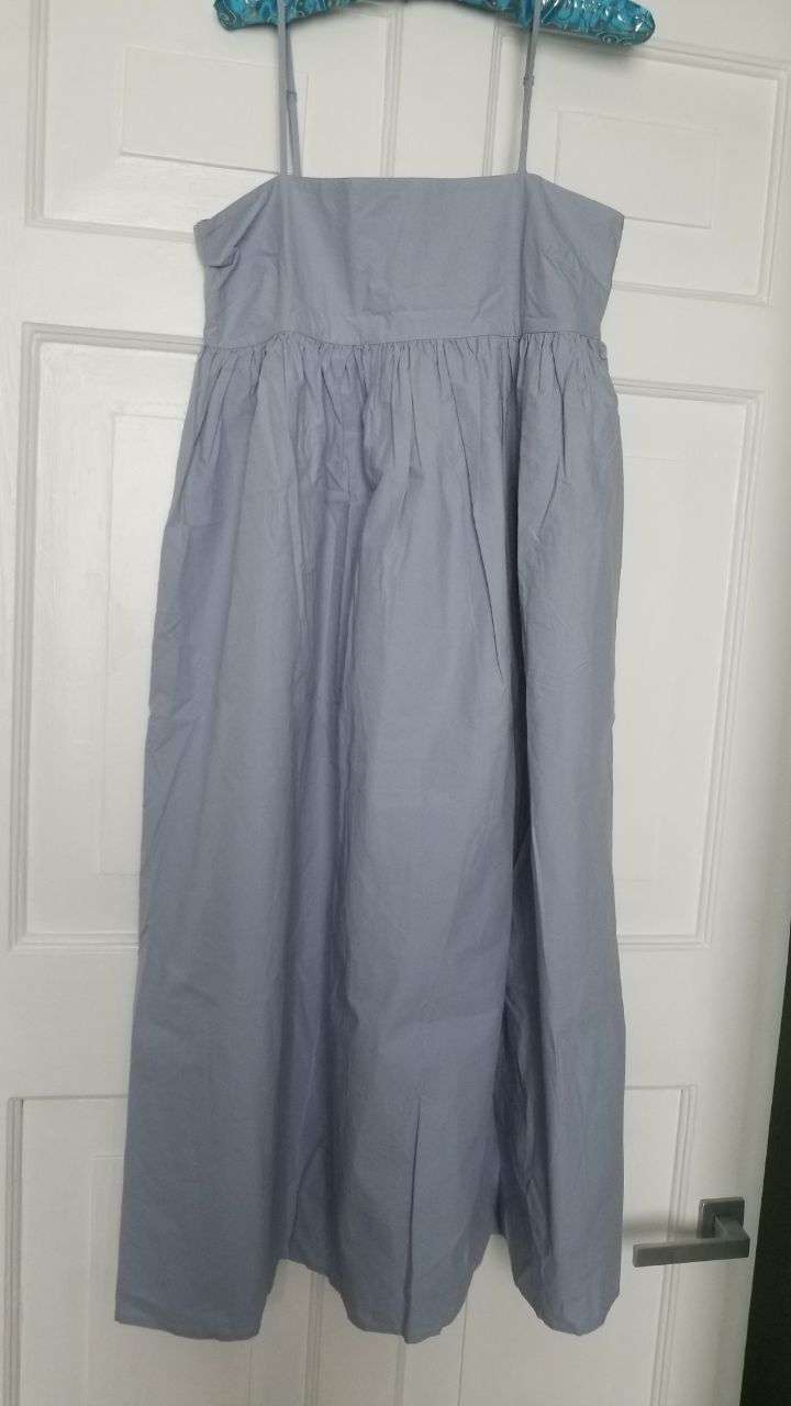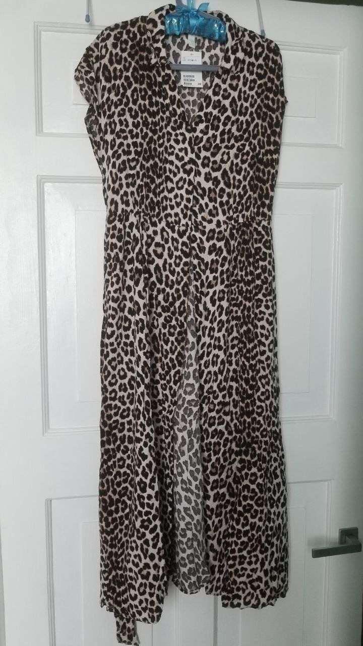 1,2 фото -платье рубашка H&M модного принта леопард. Платье с поясом, отрезное по талии, застежка сквозная скрытая, вырез углом. Написано размер М, большемерит, подойдет на 46-48. Состав - 100% вискоза. 3,4 фото - сарафан из плотного хлопка без блеска, держит форму, красивый пыльно-голубой цвет, трендовый фасон с завышенной талией и пышной юбкой, бренд collusion. Куплен на Asos. Размер указан 38, но большемерит, подойдет на 48 размер. 5,6 фото - сарафан H&M, цвет желтый, сверху собран на многорядную резинку. Есть тонкие лямки, 100% хлопок. Ткань плотная, но тонкая и легкая, сарафан держит форму. Написано размер L. Все платья по 1500р., все куплено в официальных магазинах до ухода брендов.