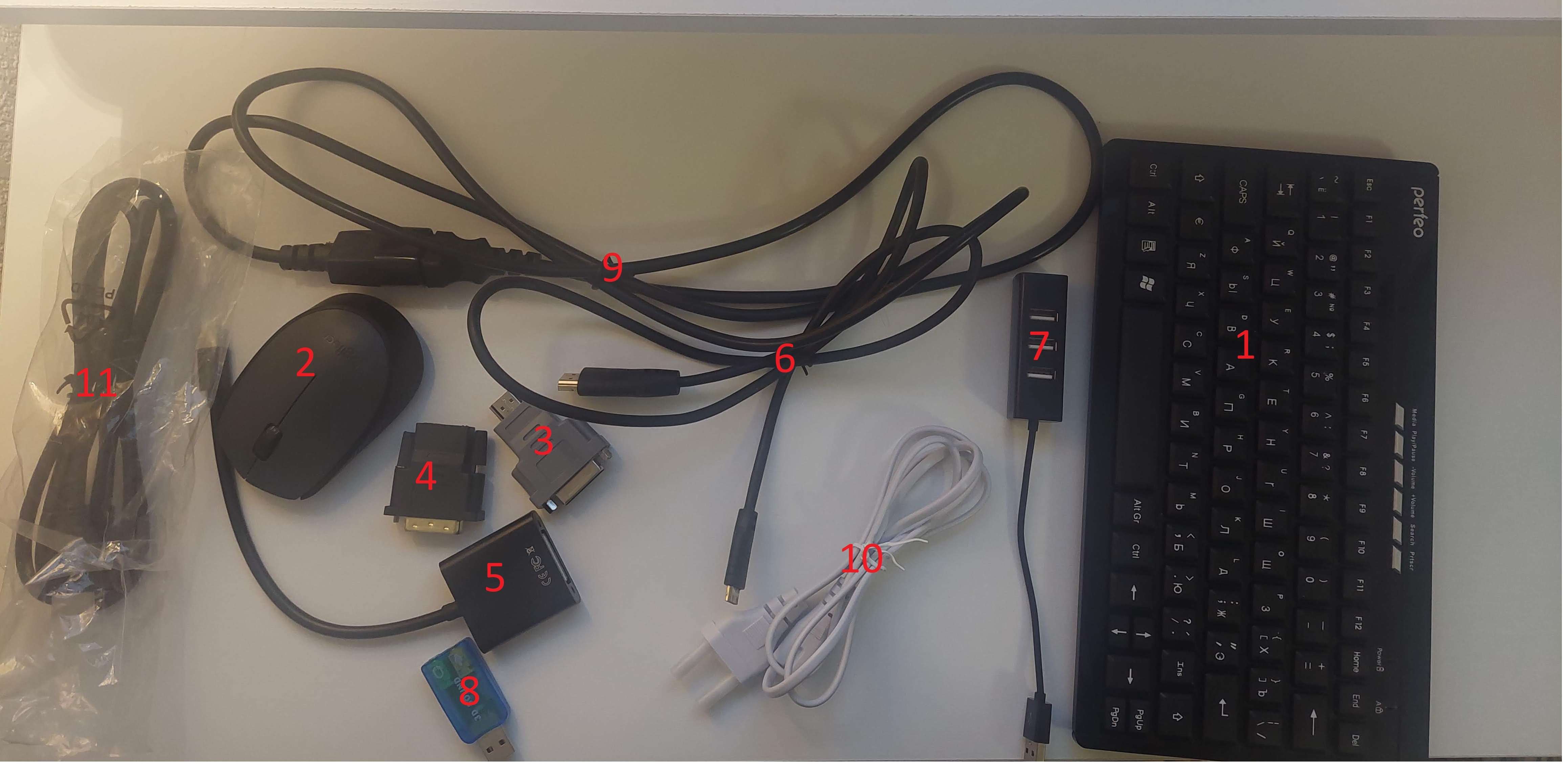 1)Клавиатура беспроводная Perfeo COMPACT PF4434 2)Беспроводная мышь Logitech M170 3)Переходник HDMI штекер - DVI гнездо 4)Переходник HDMI гнездо - DVI штекер 5)Переходник mini DisplayPort штекер - DVI гнездо 6)Кабель HDMI - mini HDMI 0.5м 7)USB хаб на 4 USB 2.0 порта 8)USB звуковая карта китайская 9)Удлинитель кабеля питания IEC C13-IEC C14 1.8м 10)Кабель питания C7 1.2м белый 11)Кабель HDMI - HDMI 1.5м Забрать можно на СХИ в будни или по выходным и вечерам в Кировском.