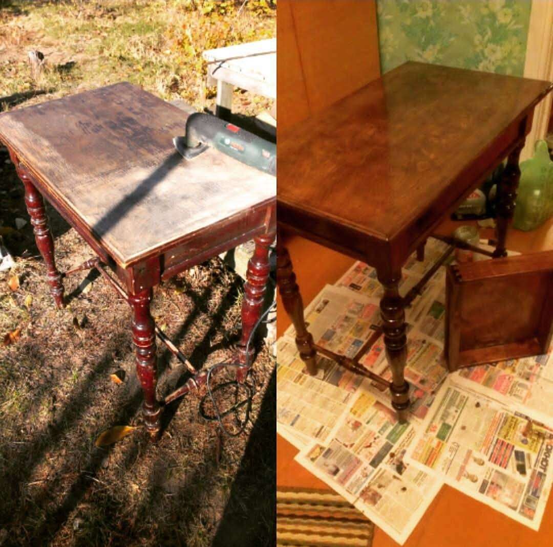 Я брал свой реноватор, шкурку для него, какую-то морилку и лак. И древний столик бабушкин сначала ободрал от старой стремной коричневой краски, а потом в несколько слоёв покрыл лаком. Столик небольшой, вдвоем за ним было тютя-в тютю. Я думал что он нахрен никому потом не нужен будет, ан нет, на авито за 6,5тыр какой-то парень забрал. Куда-то в коммерцию, мож для оформления чего-то, хз. Вот: