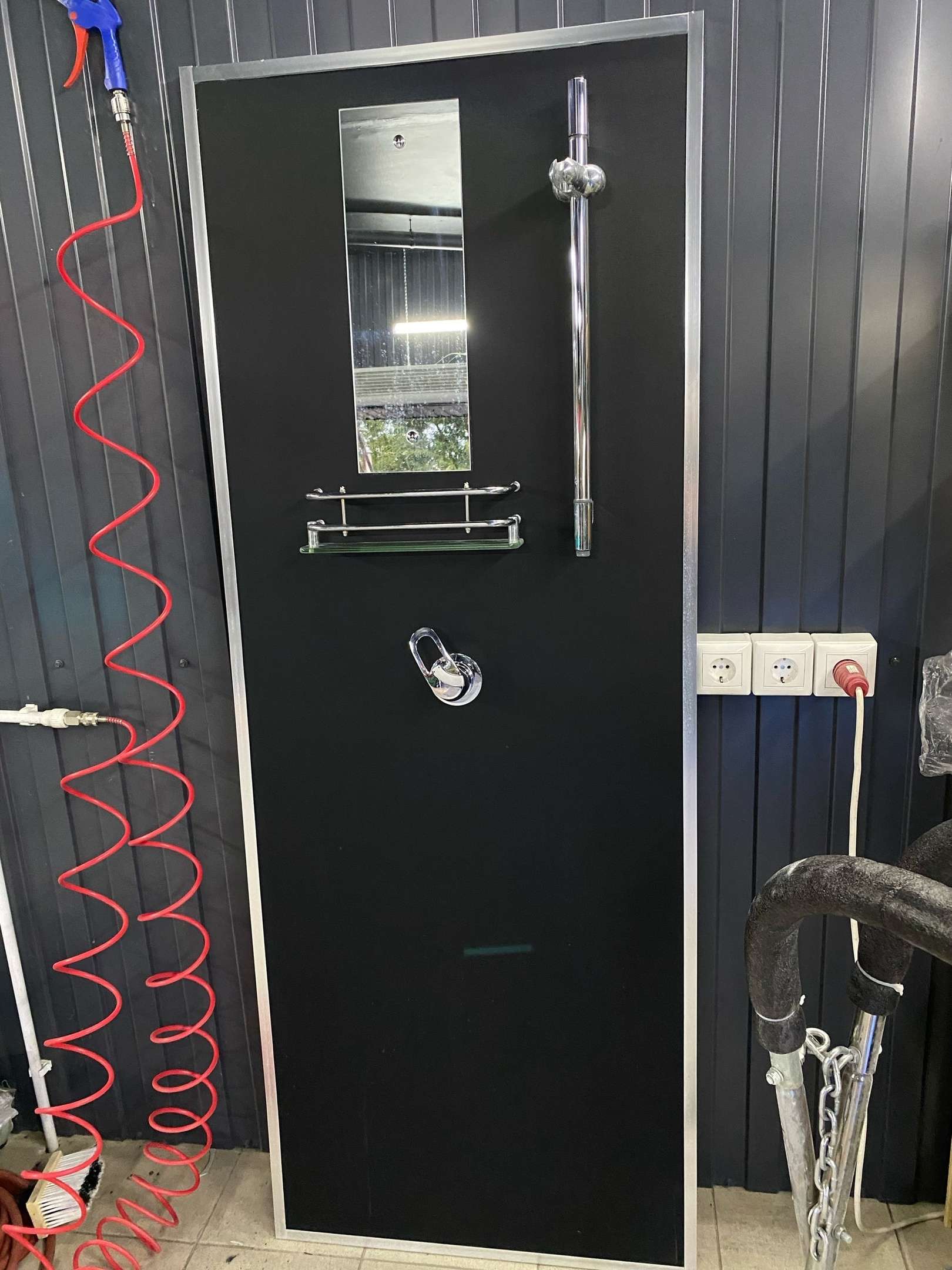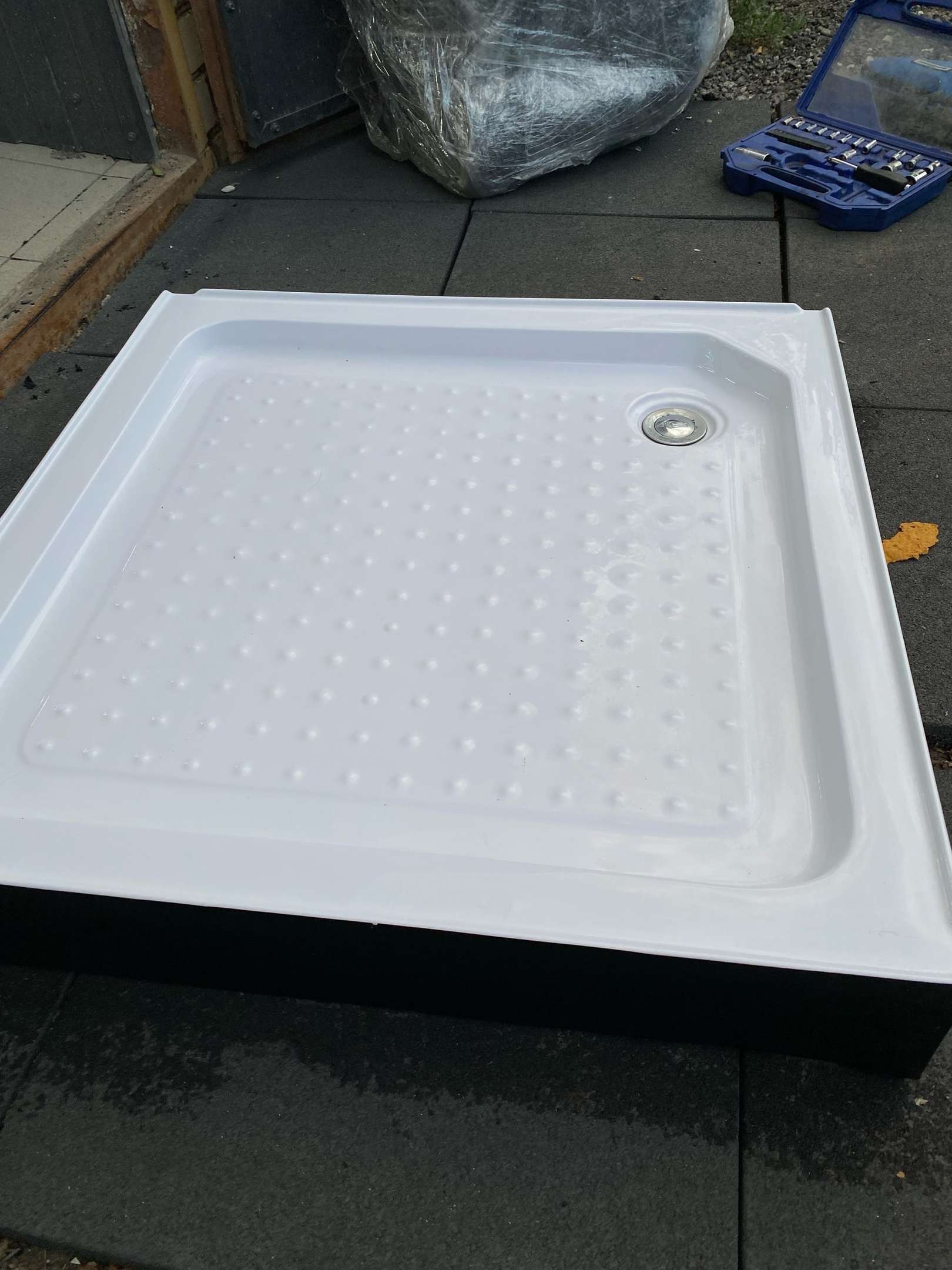 Как вариант, но это не самый лучший вариант, скорее временное решение если нет желания заморачиватся. Даже на деревянном основании можно так же сделать душевой уголок.