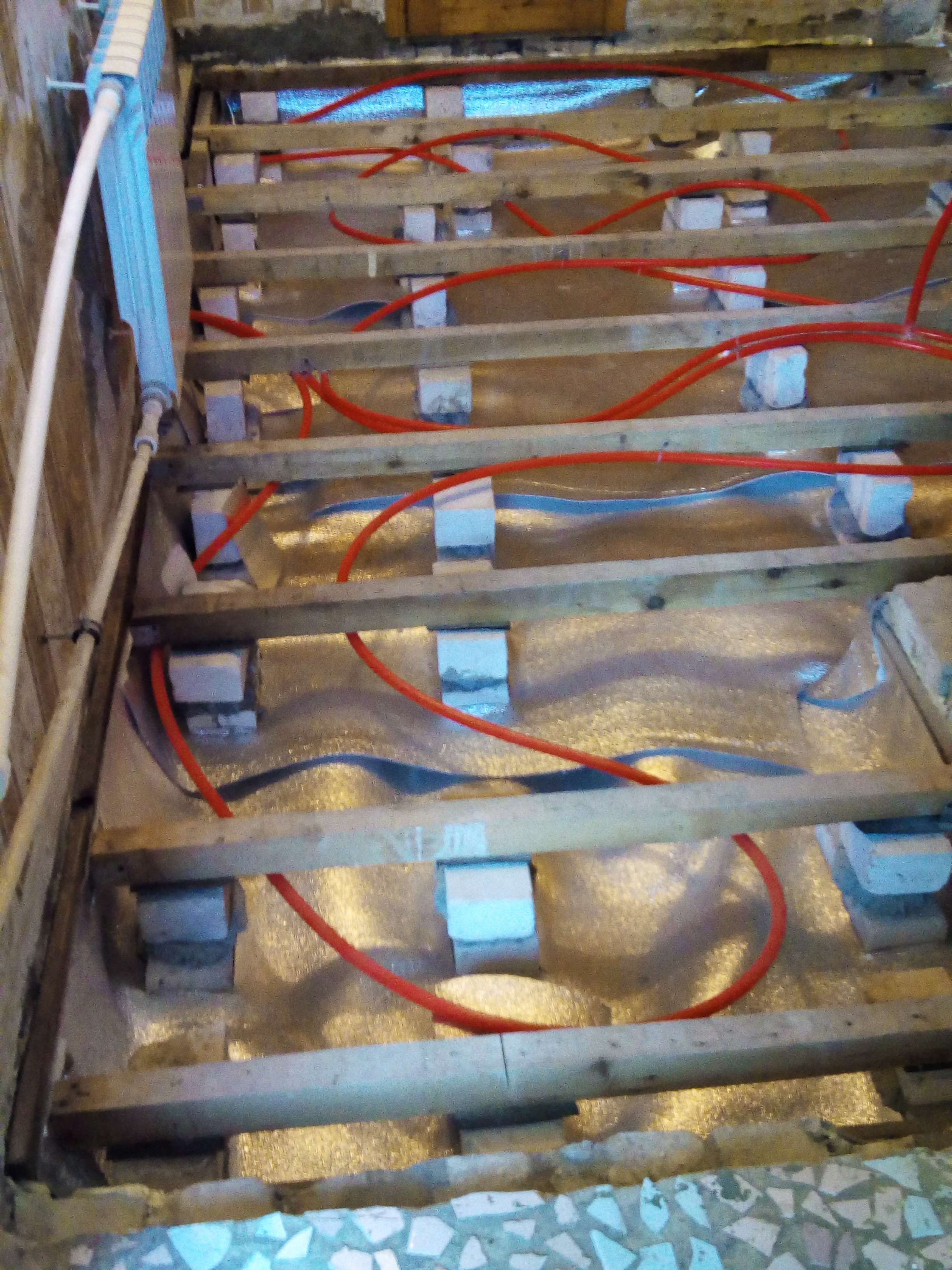 Работать будет Только трубы маловато. Я в бетон, не заморачиваясь на суперточный расчеты, тупо закладываю 6 метров на квадрат Но это с подмесом, для точного выдерживания предсказуемых температур и теплоносителя, и самой поверхности. А тут просто нужен ,предполагаю, просто немного другой расчет. Хотя, повторюсь, и так будет работать - будет просто нехолодный пол - неосновной источник обогрева. Ведь все равно же в помещении и радиаторы есть же? Только, единственно, трубы всё-таки выровнял по горизонтали, от завоздушивания. Ну и закрепил получше - а то будет шевелиться и возможны всякие незапланированные ненужные эффекты : от накопления усталости материала от температурных изгибов - до стучащих и скрежещущих в ночи подпольных барабашек))