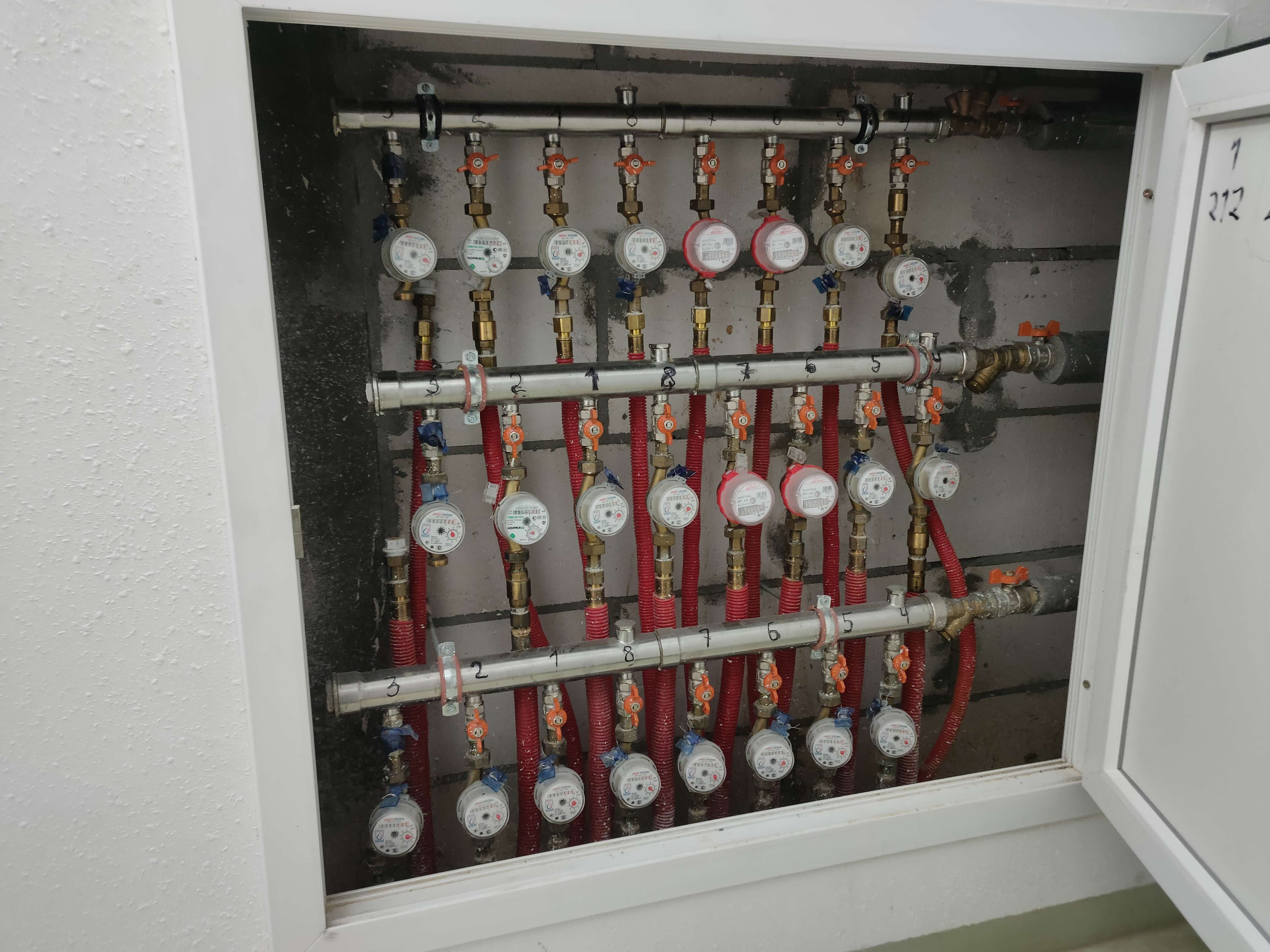 Вот-вот. Ну походу у него в подъезде точка и из неё трубы идут по полу, одна пара на водоснабжение, вторая на отопление. Только он всё равно напутал. На ГВС не ставят счётчики на подачу и обратку. А у него ставят