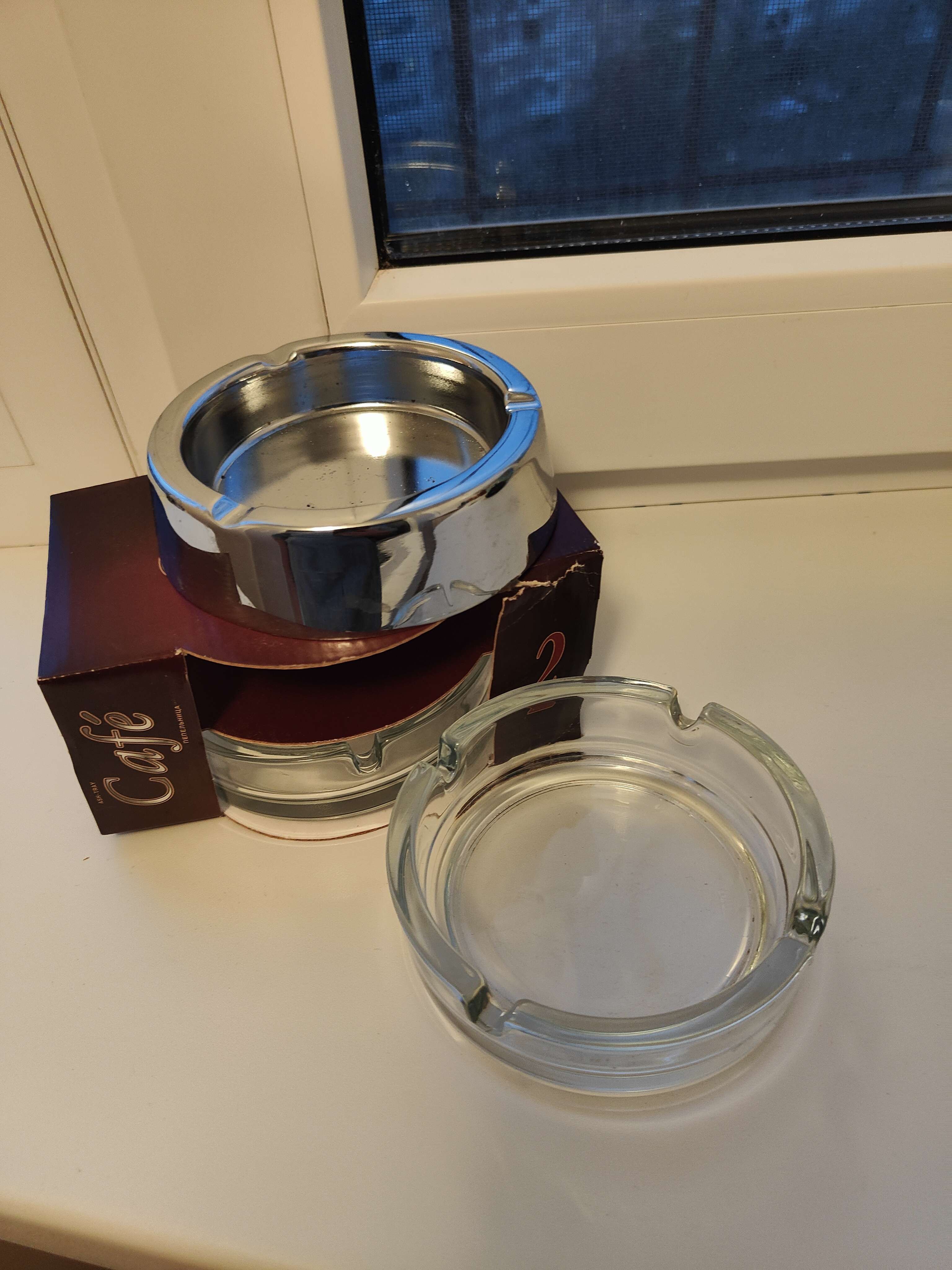 Пепельницы по 100 Пепельница подарочная керамика в коробке 1000 Новые фужеры для вина - 500 Подставка под ТВ - 300 Бокалы Люминарк -300 Кофейный набор - 500 Новый кофейный набор - 1000 Пивные кружки Балтика 2 за 400 Бокалы для виски побольше и поменьше по 3 по 300 Набор для специй - 250 Выбивала для ковра -300 Резиновая грелка -300 Малый табурет -200