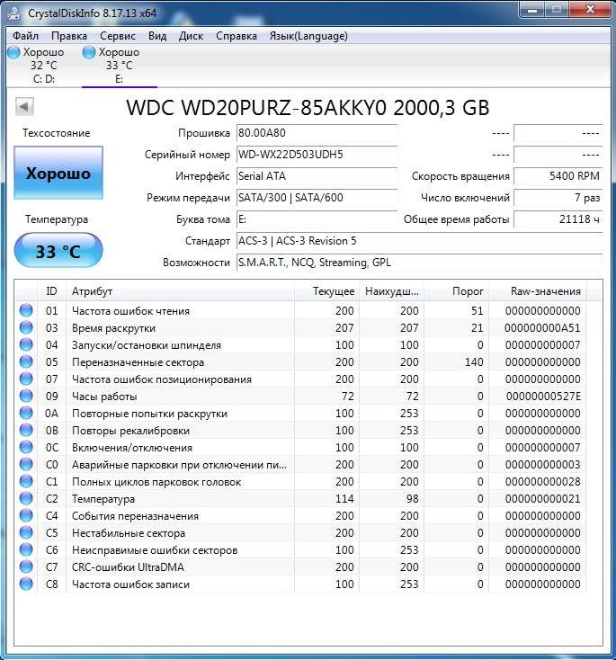Продам жесткий диск 3.5" 2Tb WD Purple WD20PURZ-85AKKY0 Состояние на скринах. 2300 рублей.