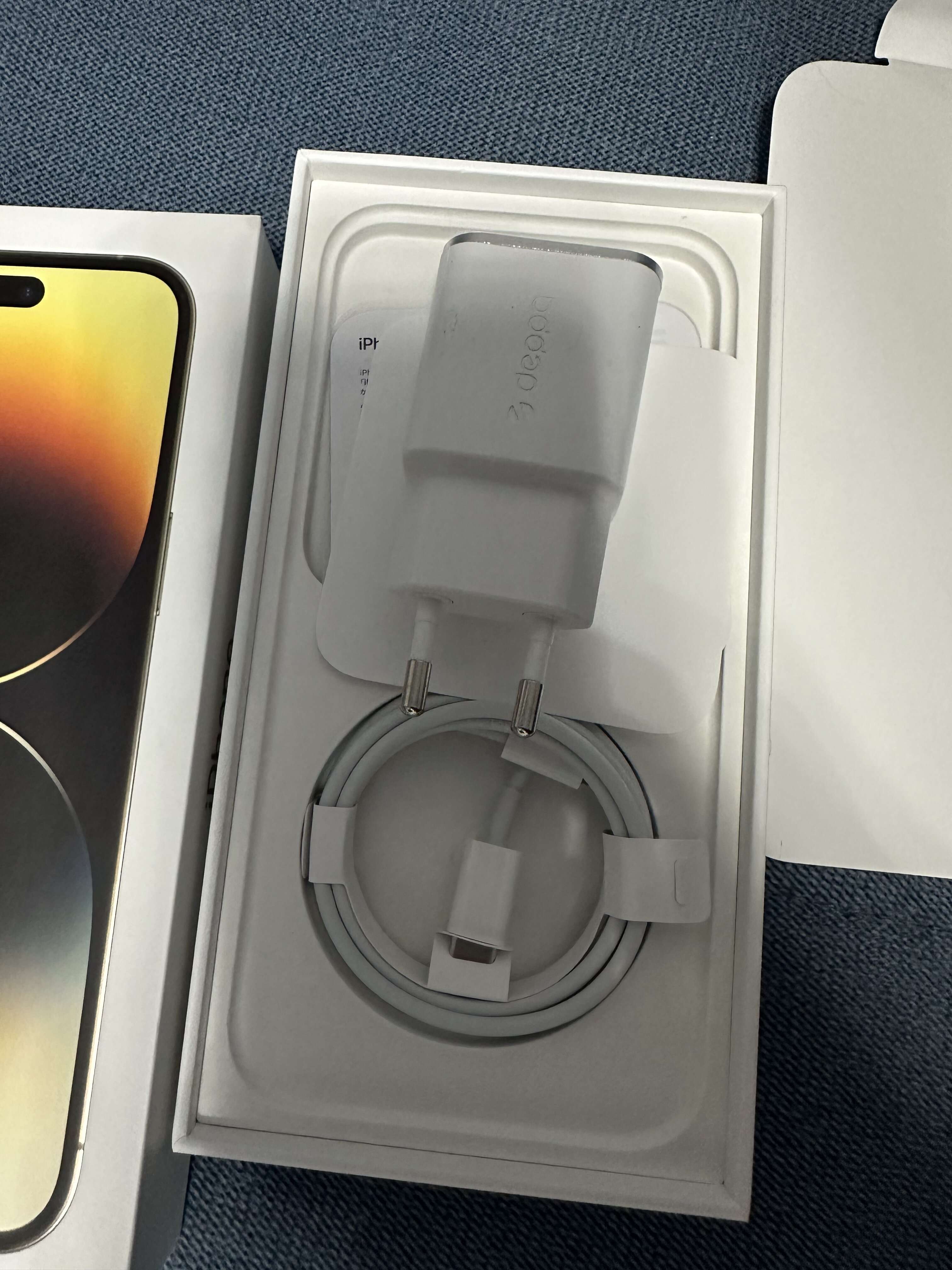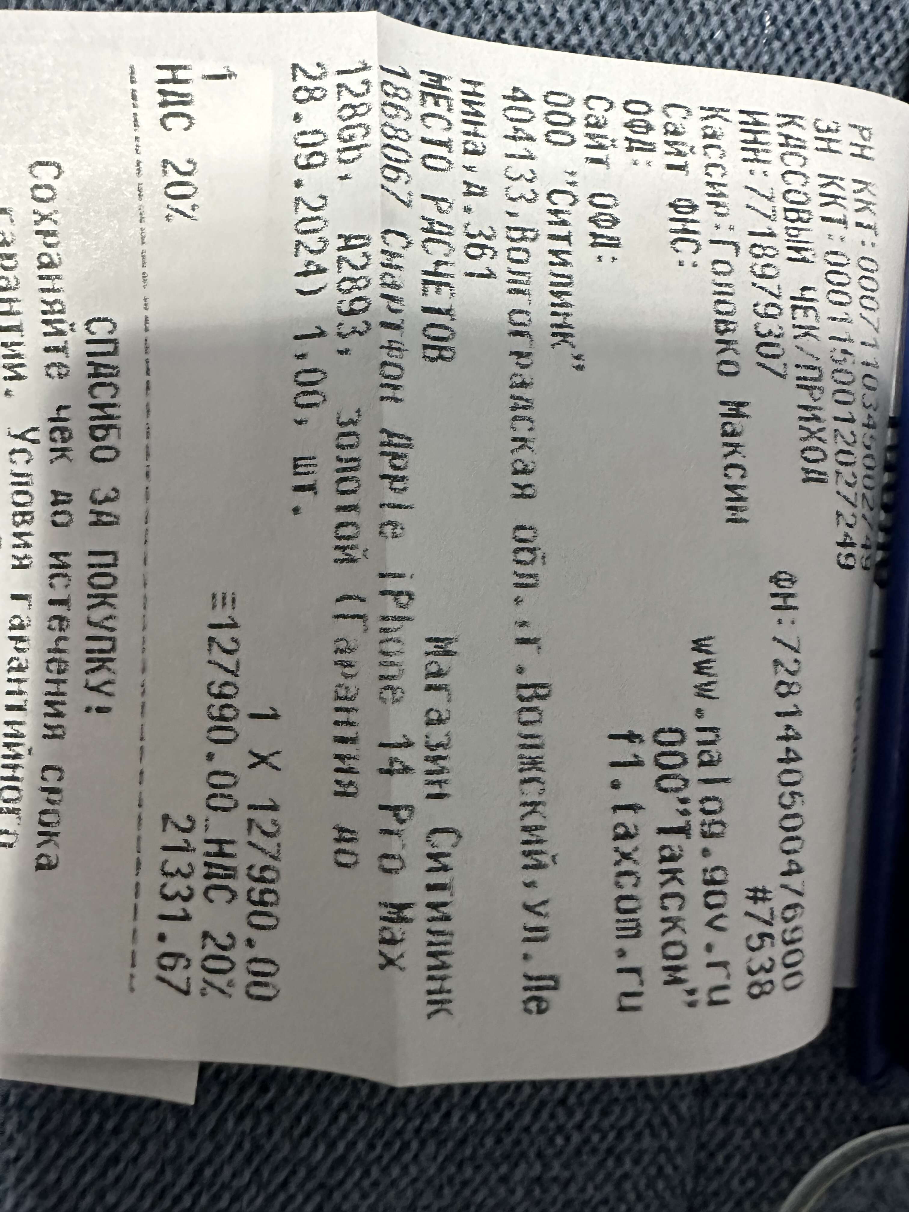 Добрый День! iPhone 14 pro max 128 gb. Куплен в Ситилинке 28 сентября 2023 года. Соответственно гарантия до 28 сентября 2024 года. На экране наклеено стекло. Версия сим+есим. телефон в идеале, все работает как надо, любые проверки. Все что на фото идет комплектом к телефону. Торг есть. Лучше сразу звоните +79377061991 Михаил. Цена 93500. Цвет - Золотой
