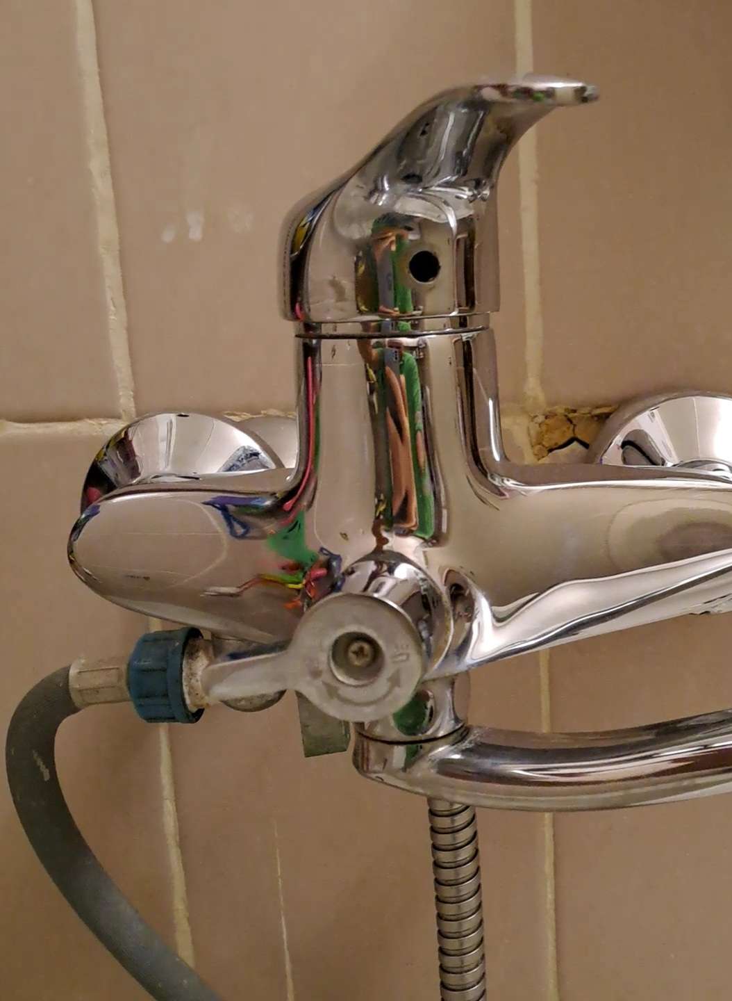 Обычный смеситель в ванной с рычожком вверху. Когда включаю воду, то подтекает снизу. Если выключено всё, то нигде не подтекает. Картридж менять или где-то прокладочку?