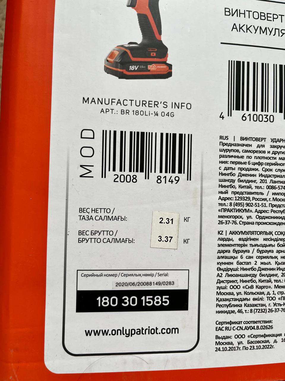 Продается винтоверт PATRIOT BR 180Li 1/4 UES (180301585). Новый, в использовании не был. По цене 6500 примерно.