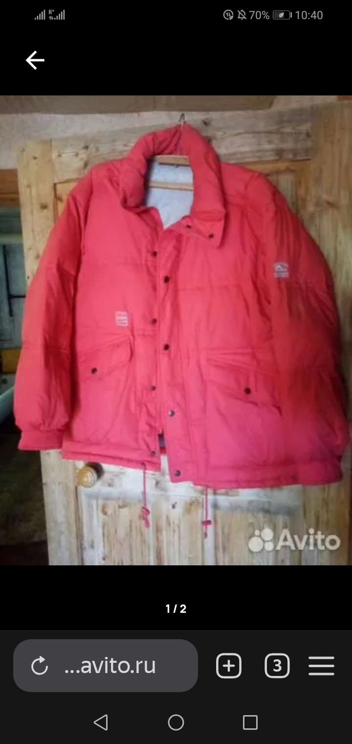 Здравствуйте. Коричневого цвета куртка одевалась 1 или 2 раза. Шуршащий материал, очень лёгкая. Красная куртка б/у. Более тёплая.
