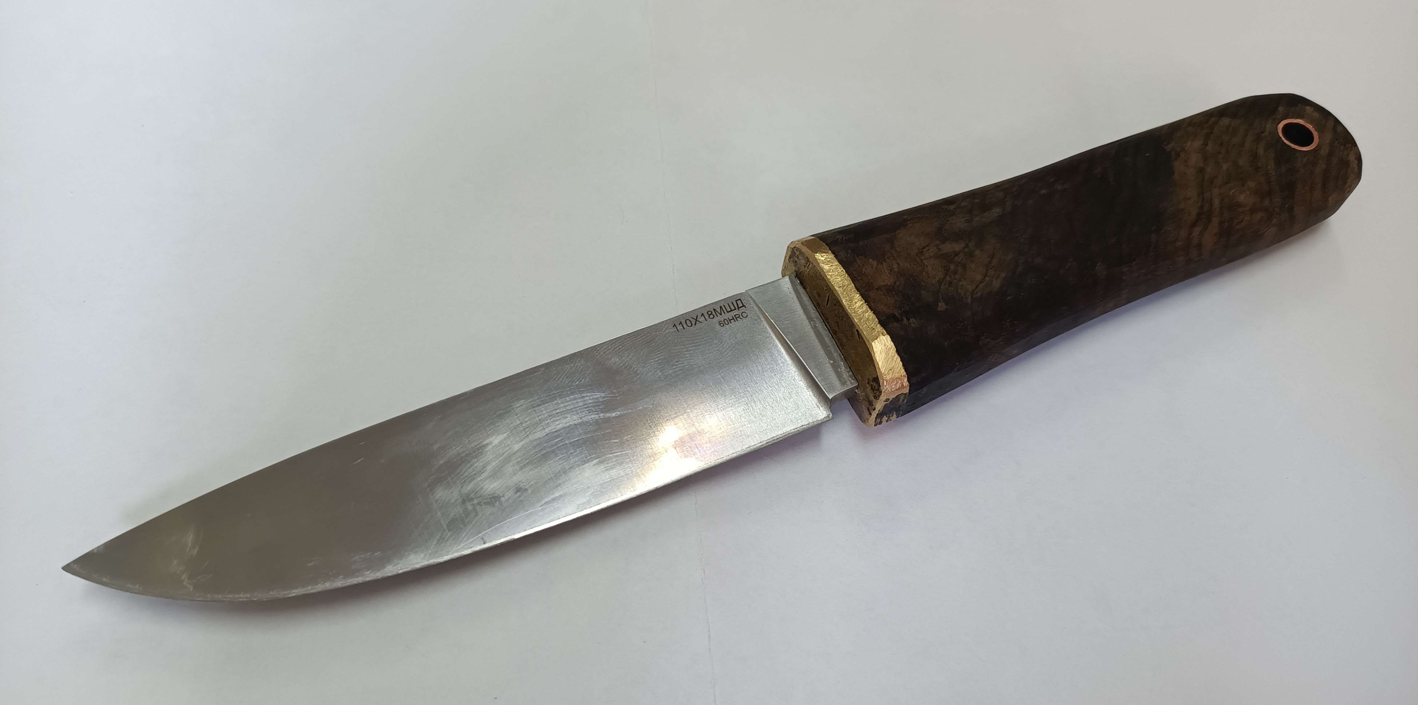 Привет всем! Купил клинок у этих товарищей (не реклама) из стали 110Х18МШД с твёрдостью 60HRC за 2134 вечнодеревянных (с пересылкой вышло около 2500). Купил на Авито две деревяшки из комля ореха по 200 руб. с пересылкой 117руб. Рукоятку сделал в якутском стиле со своими идеями из тёмного бруска, больстер из бронзы, отверстие для верёвочки 8мм с медной втулкой. Пропитал льняным маслом с воском (высыхает за сутки). Клинок приходит незаточенным, точить самому (режущую кромку, это около 0,4мм). У меня пока нет точильного станка, точил брусками вручную. Точить такую сталюку - это нечто! пару часов (не меньше) убил на это. НО, рез радует! эта железка, вообще, интересная.