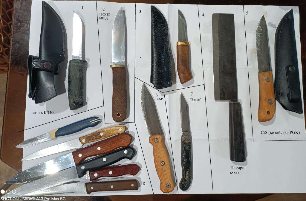 8. разные обычные ножи на кухне. в основном Tramontina. дешёвые, сталь так себе, легко точатся, но и тупятся прям "на глазах". там сталь уровня нашей 40Х18. больше такие не беру:tongue: