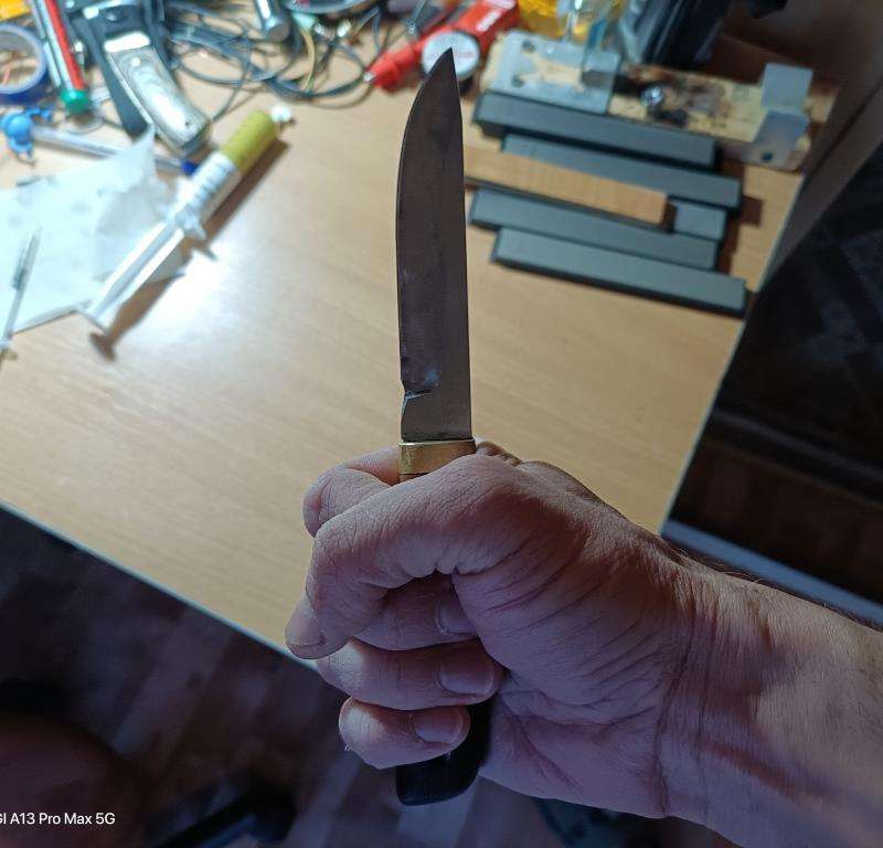 2. нож из российской (советский ГОСТ) стали 110Х18МШД. купил готовый клинок, рукоять сделал сам из бронзы и ореха (купил бруски на авито), несколько раз точил. сейчас живёт на кухне. режет класс. точится не сложно.