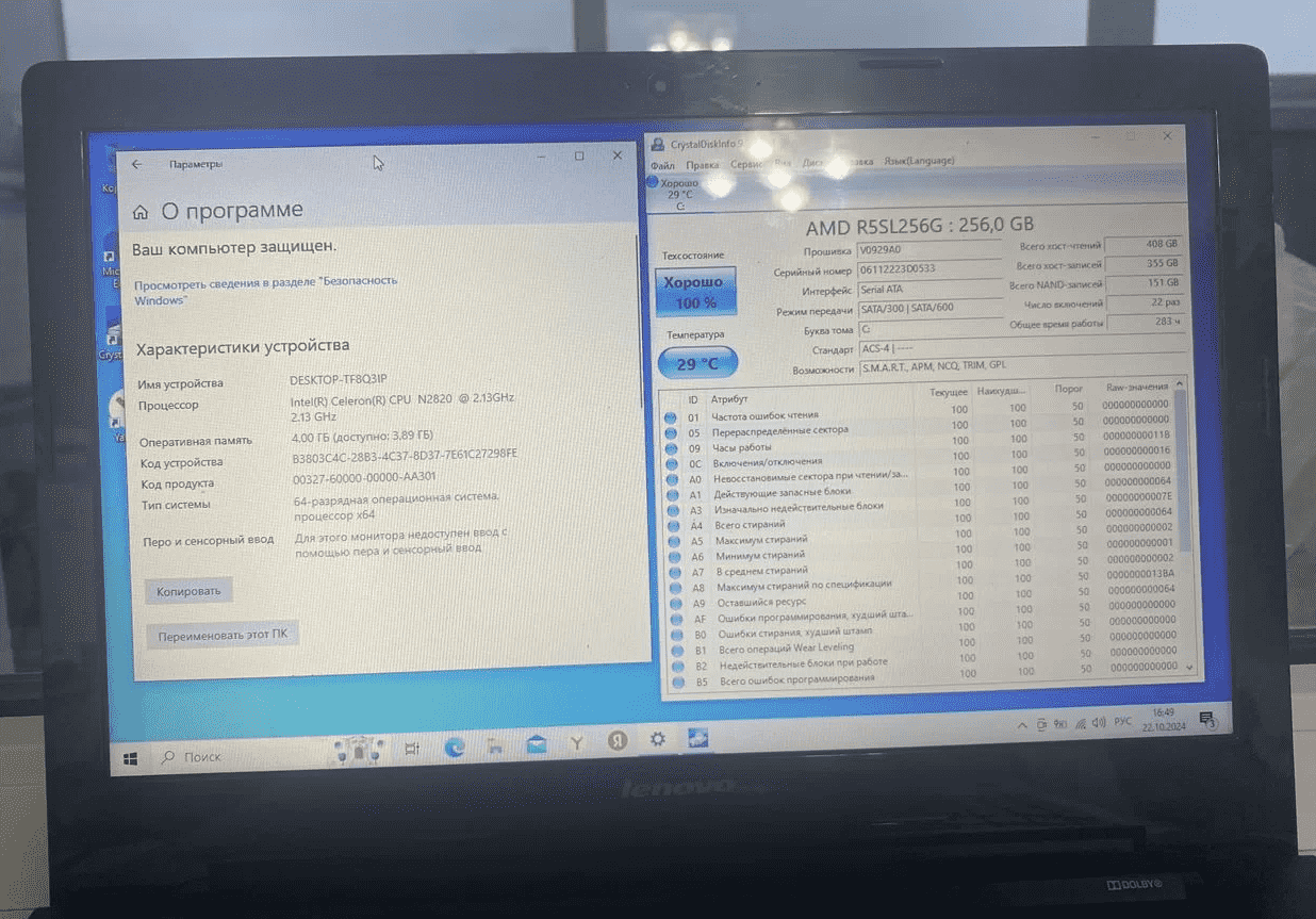 Lenovo G50-30 CPU Celeron n2820, озу 4ГБ, ssd 240gb Ноут в не плохом состоянии, АКБ нет, офисная эксплуатация как печатной машинки и серфинга в интернете. Все исправно. На фото три полосы от камеры, их нет на крышке. 5 тр.