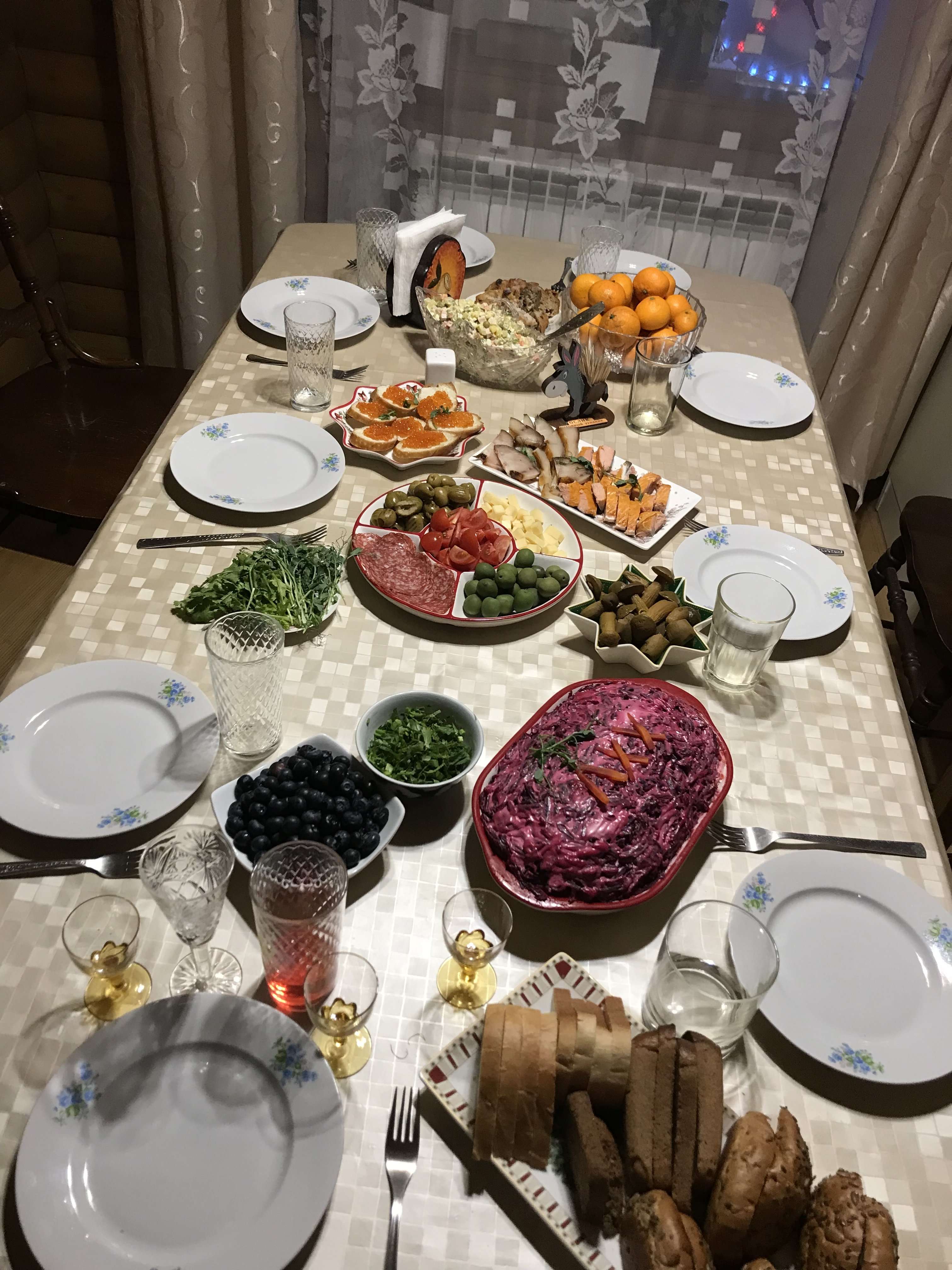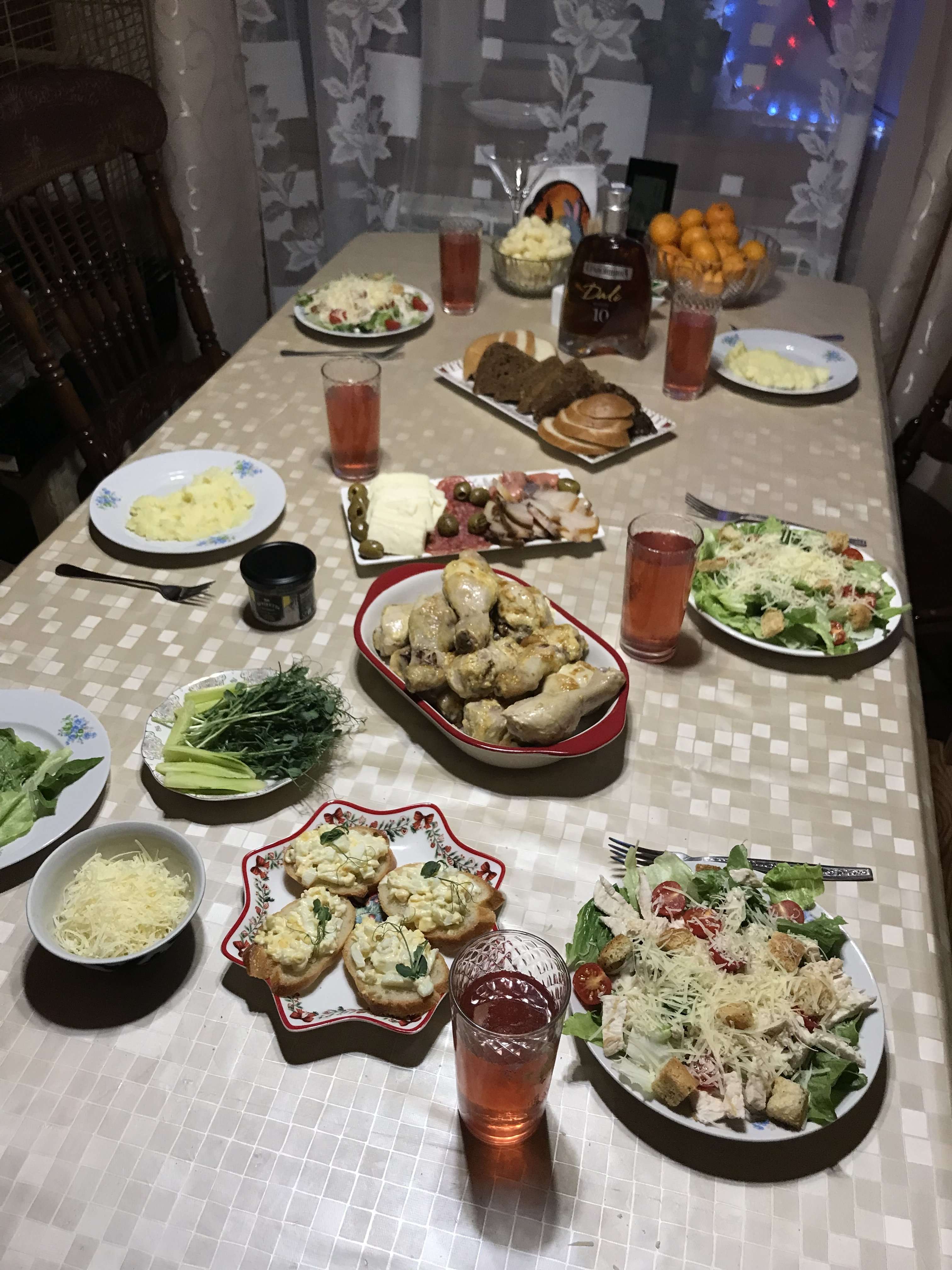 Оливье Цезарь Крабовый Свиная шейка шашлык Мясо по-французски Вкусные оливки маслины, гриль, в масле и какие-то ещё Разнообразная солёная рыба Икра красная Пюре картофельное Мандарины абхазские, с доставкой в Москву из Абхазии через Волгоград Штоллен! Карбонат запекать буду …. Апероль, мартини, коньяк, виски, текила, просекко, шампанское)) И свекровин компот! Это был план на все НГ каникулы)) Осуществили и список и плюсом, большая семья жрунов Штоллен покупаю, сама своими руками пока не добралась испечь. Четвёртый или пятый уже, год, беру у знакомой, вкусный он получается у неё. В прошлом году ещё сама пекла медовик на НГ, в этом морально не осилила выпечку)