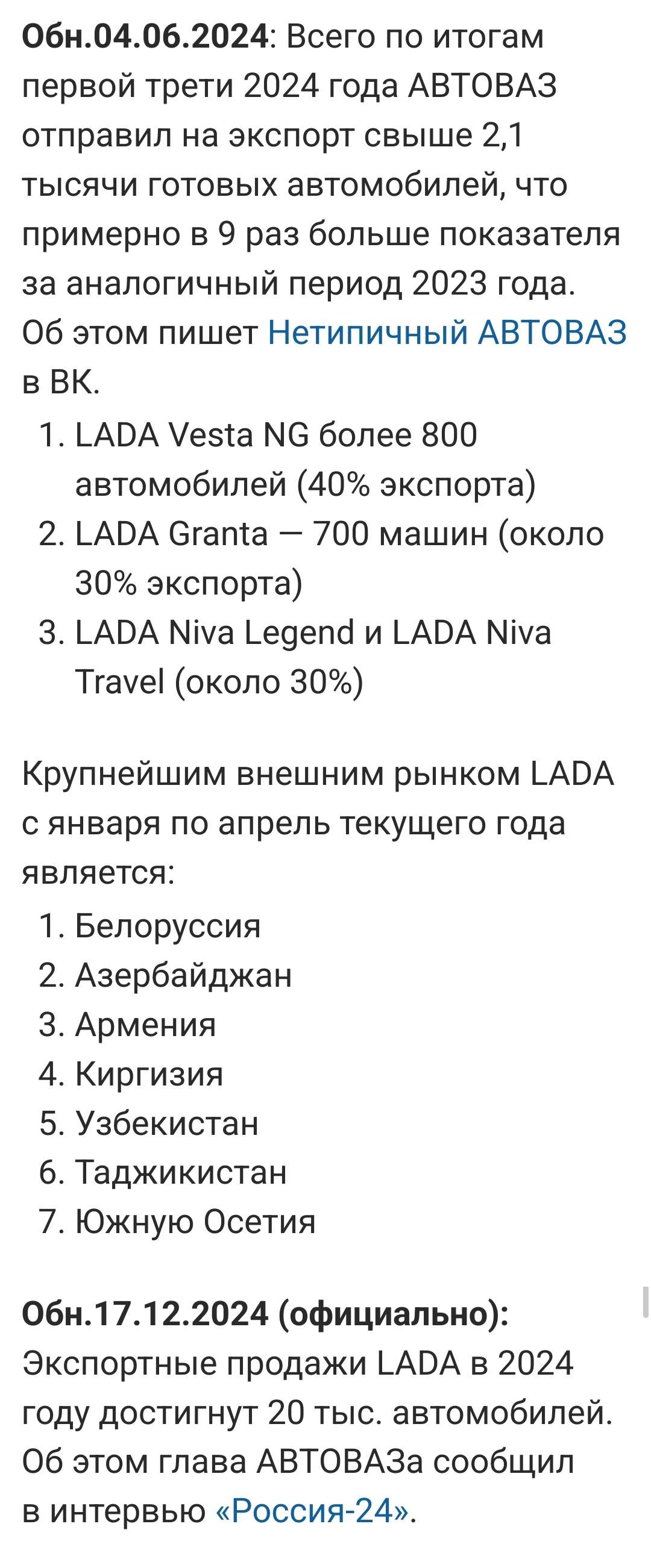 Вам же задали вопрос - с учётом России? Я бы еще Казахстан добавил. Году в 15-16 знаю, что Granta продавалась в Словакии и Чехии, вроде. С учётом нынешней "оптимизации" - отсутствие подушек безопасности, экологического стандарта, смею полагать дорога в старый свет автомобилям Lada заказан. Да и зачем им наши поделки, когда у них у самих есть недорогие варианты аналогичных авто? На праздниках был в Берлине, видел парочку BYD. Этот рынок сейчас больше интересуется "электричками", на фоне безумства зелёных.