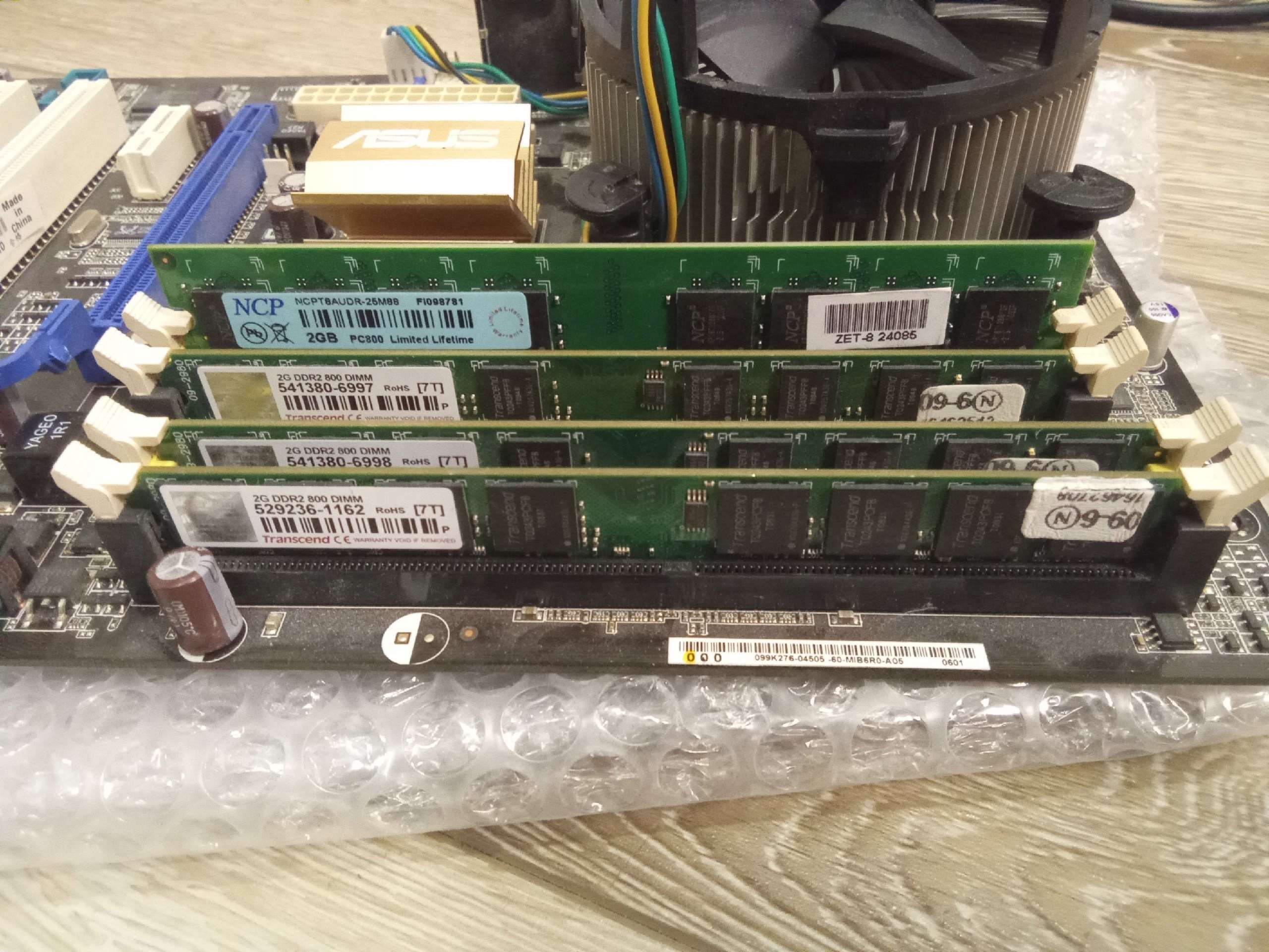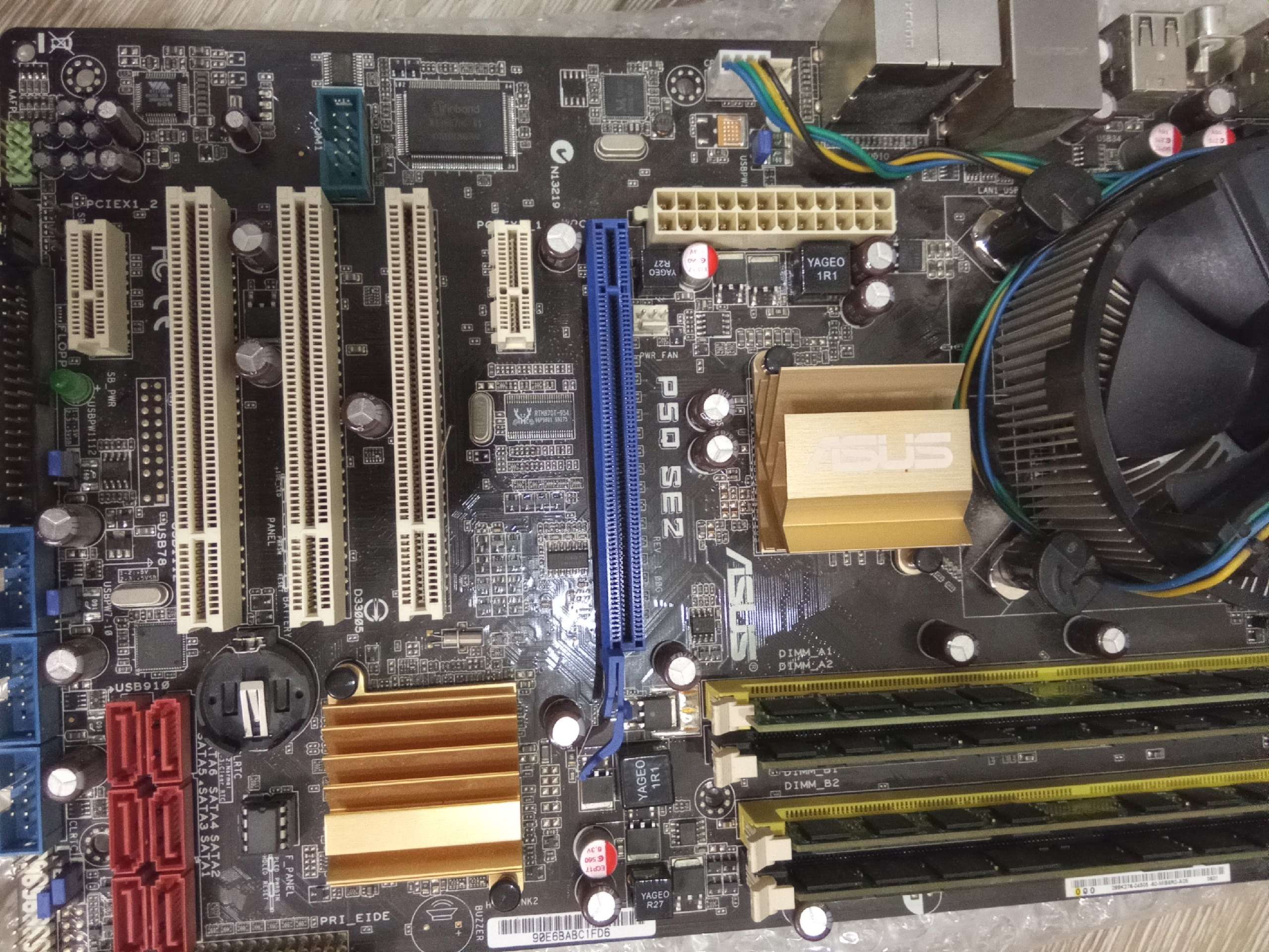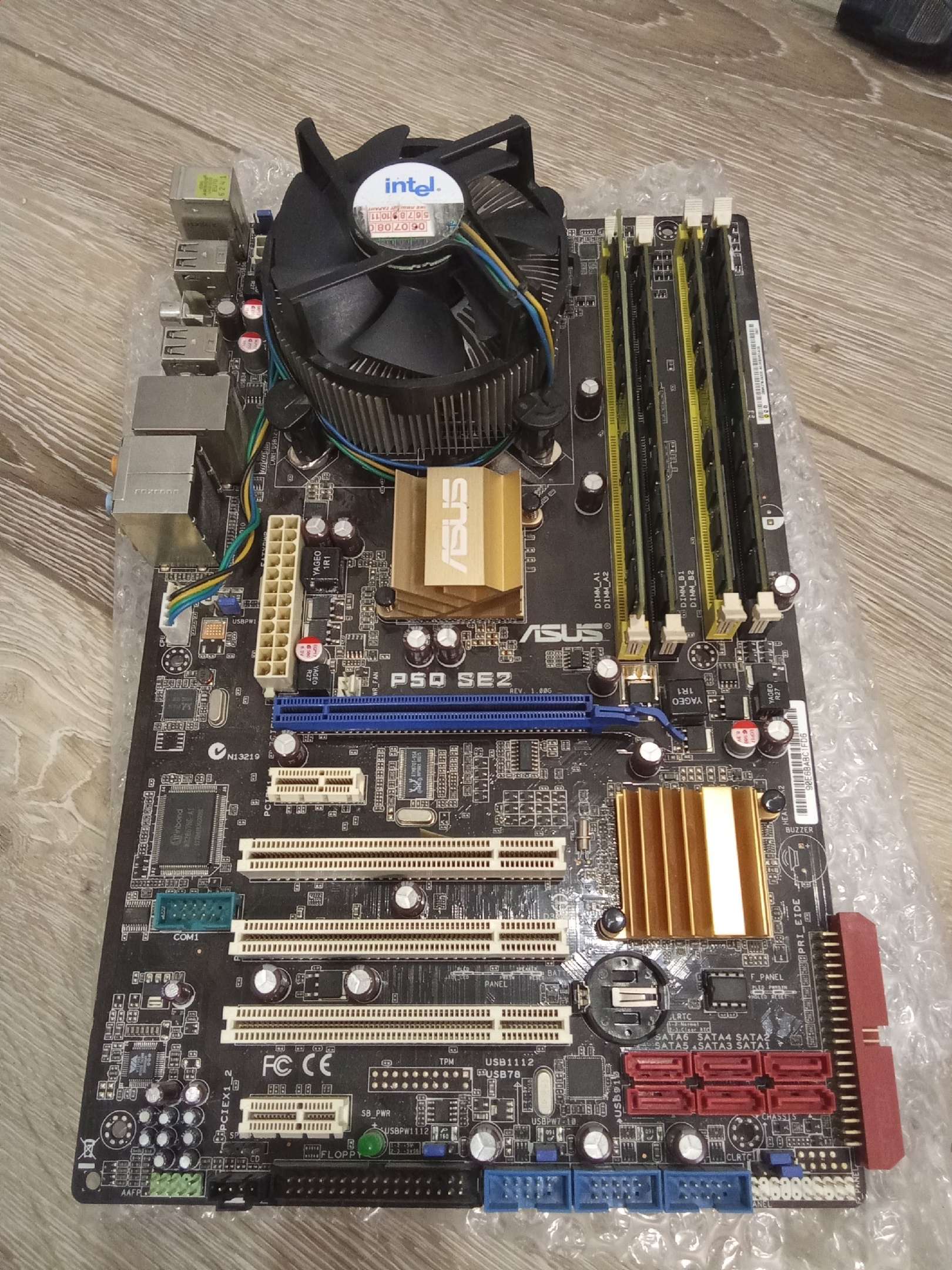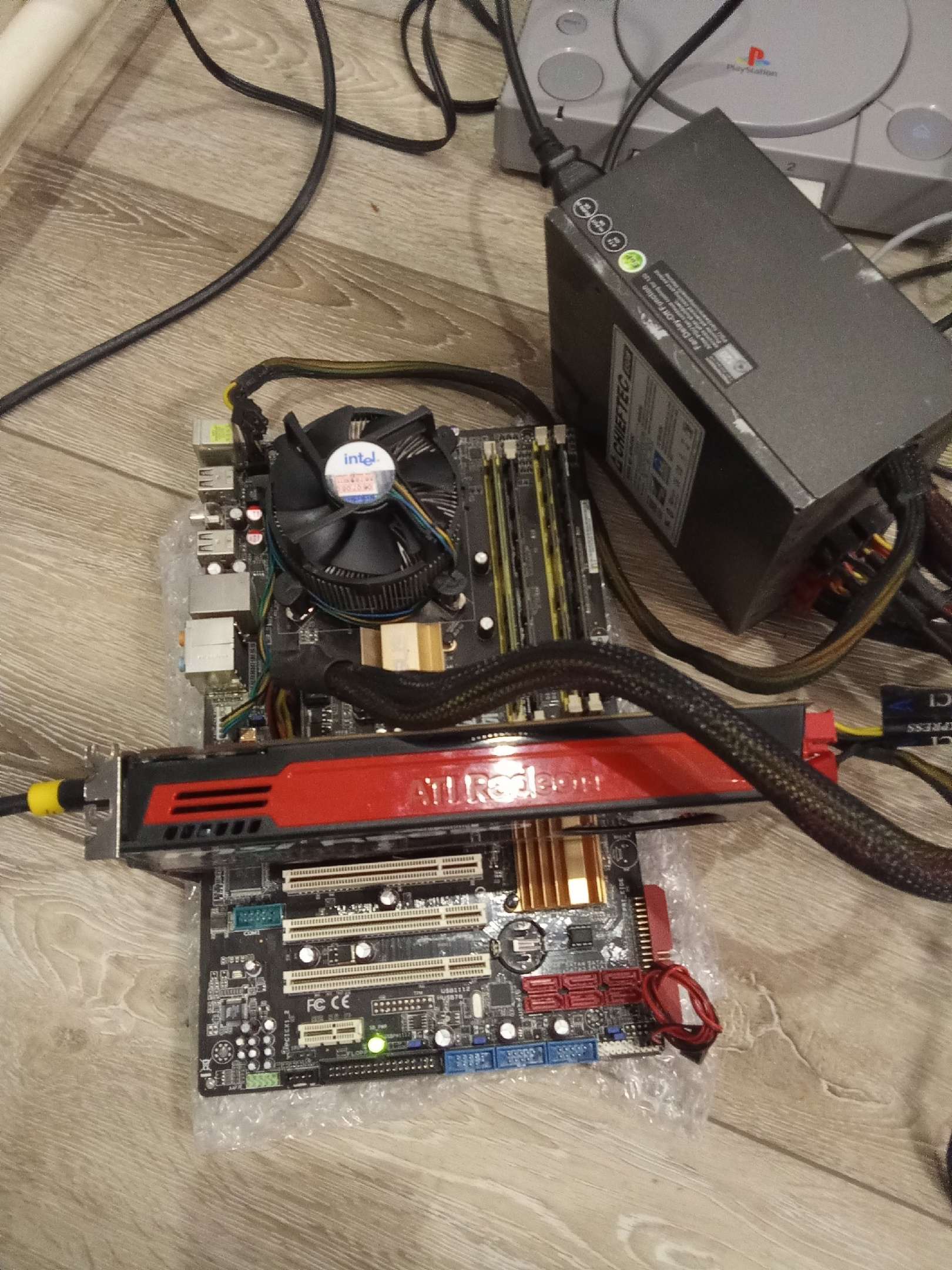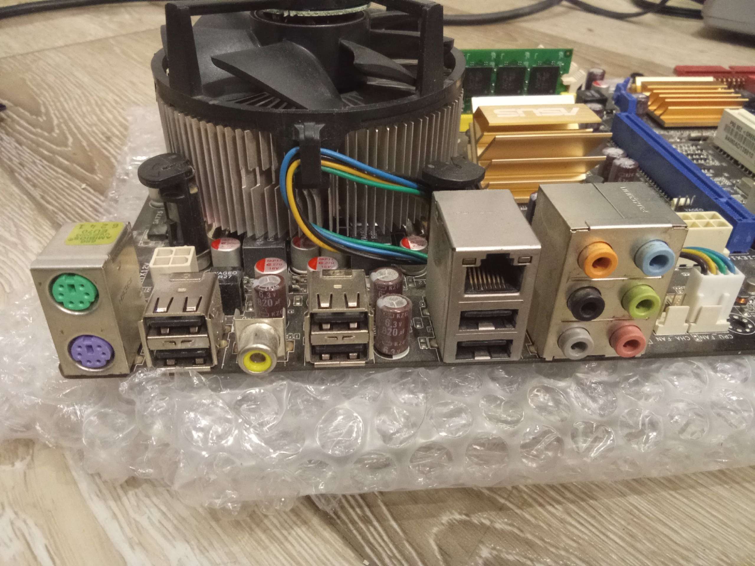 Выставляю на продажу винтажный комплект) Все показано на фото. Работает. Винду не ставил, порты ЮСБ работают. 4 ядра, 8гб оперы, кулер с медяхой, кулер самый мощный, боксовый. Надо поставить батарейку и намазать термопасту. Если у вас нет хорошей нет пасты намажу свою Zalman. Проц горячеватый, но кулер его вывезет. Батарейка где-то тоже валялась рабочая. Видюху поставил для проверки, могу тоже продать. Заглушки от мамки - нет, по цене комплект отдам недорого.