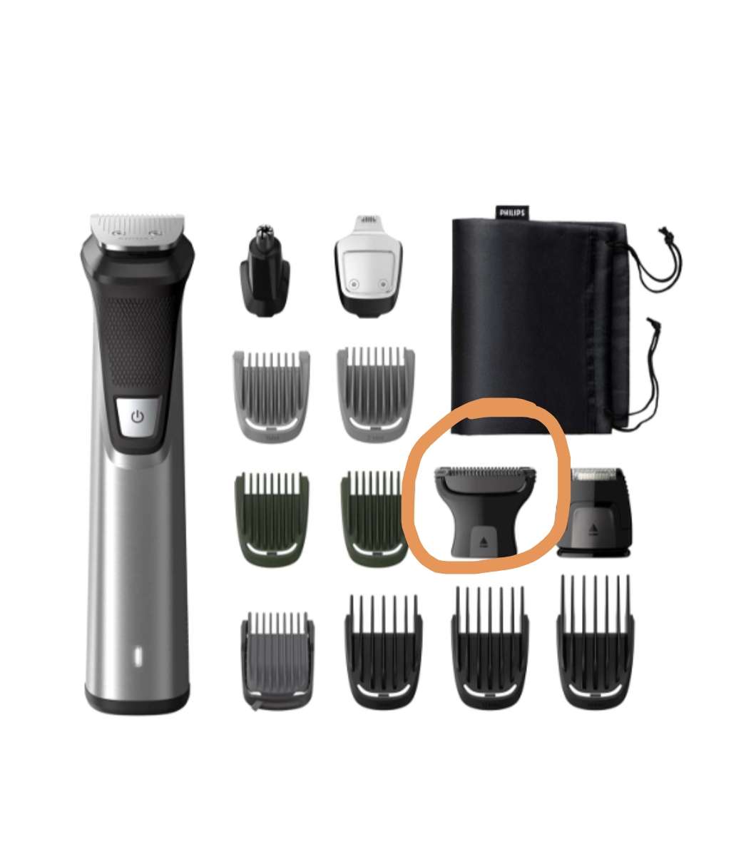 Бреюсь набором Philips MG7745/15 Держит зарядку месяцами, но я и пользуюсь не каждый день. Равняю бороду, брею шею и щёки, время от времени. Также, есть насадка - триммер для носа, это по соседней теме. У данного триммера есть прекрасная т-образная насадка, бреющая под ноль без раздражения. На фотографии её обвел. Шея, даже кадык, ни малейшего намека. Самая безопасная, что я пробовал.
