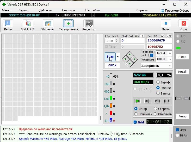 для ссд проверки поверхности бесполезно делать проверить логически с помощью chdsk и заменить на новый