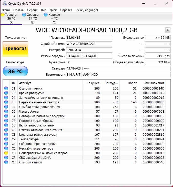 Western Digital WD10EALX. Трудился верой и правдой много лет. Состояние на скрине. Территориально - Красный. Репина. Цена 500 р сойдёт?