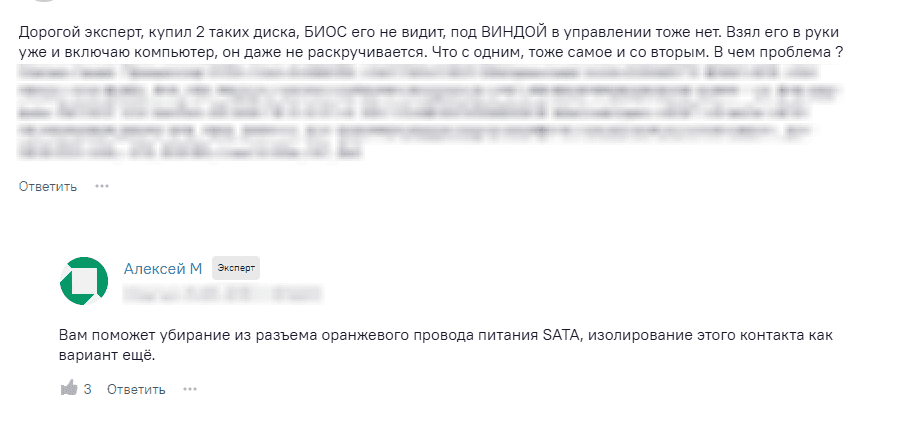 купил другой такой же почти. Работает прям очень хорошо. Но тоже чуть кирпичей не отложил ... Оказывается для этой модели диска, нельзя что бы в проводе питания был провод с 3,3 вольта. С ним диск просто не запускается даже ... А кто ж знал то ... Только через Molex или проводок откусить от разъёма. Блин, я чуть в штаны не наложил когда первый раз подключил, а он просто мертвый ... Хорошо догадался через док-станцию включить, через него заработал. Тогда полез в инет и там оказывается это известныя проблема ... В описании не указано что 0F27457 HUH721008ALE604 с "Power Disable Pin (Pin3) Feature". Для работы с этим диском контроллер SATA должен соответствовать спецификации SATA 3.3 иначе двигатель диска может не запускаться и в результате BIOS его не увидит. Подробнее см.: http://www.hgst.com/products/hard-drives/ultrastar-he10 Важно: если объединить блок питания со старыми разъёмами SATA, обеспечивающими 3,3 В на P3, и новый HDD, поддерживающий функцию PWDIS, HDD не запустится — он будет видеть непрерывный сигнал высокого состояния на P3. Решения Использовать 4-контактный адаптер Molex-to-SATA для подачи питания на HDD — он удаляет сигнал 3,3 В с P3 разъёма SATA, и HDD запустится нормально, но поддержка PWDIS не будет отсутствовать. Использовать блок питания с разъёмами SATA, соответствующими спецификации SATA 3.3 — это устраняет проблему, если используется устаревший разъём SATA.