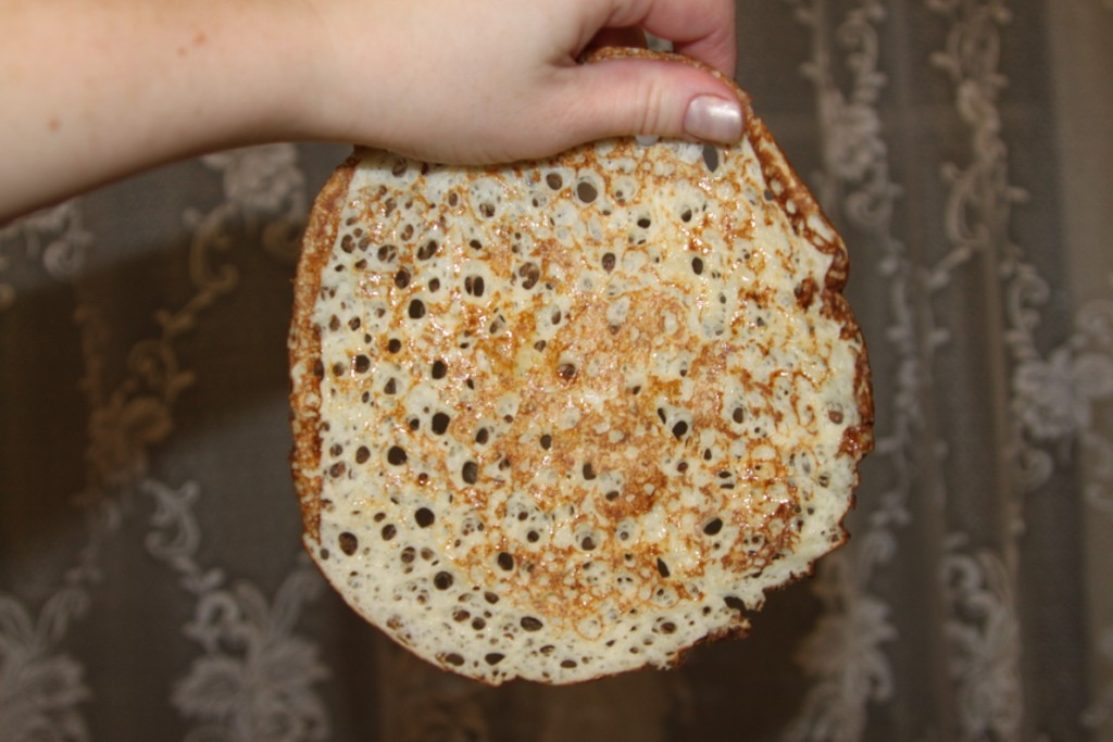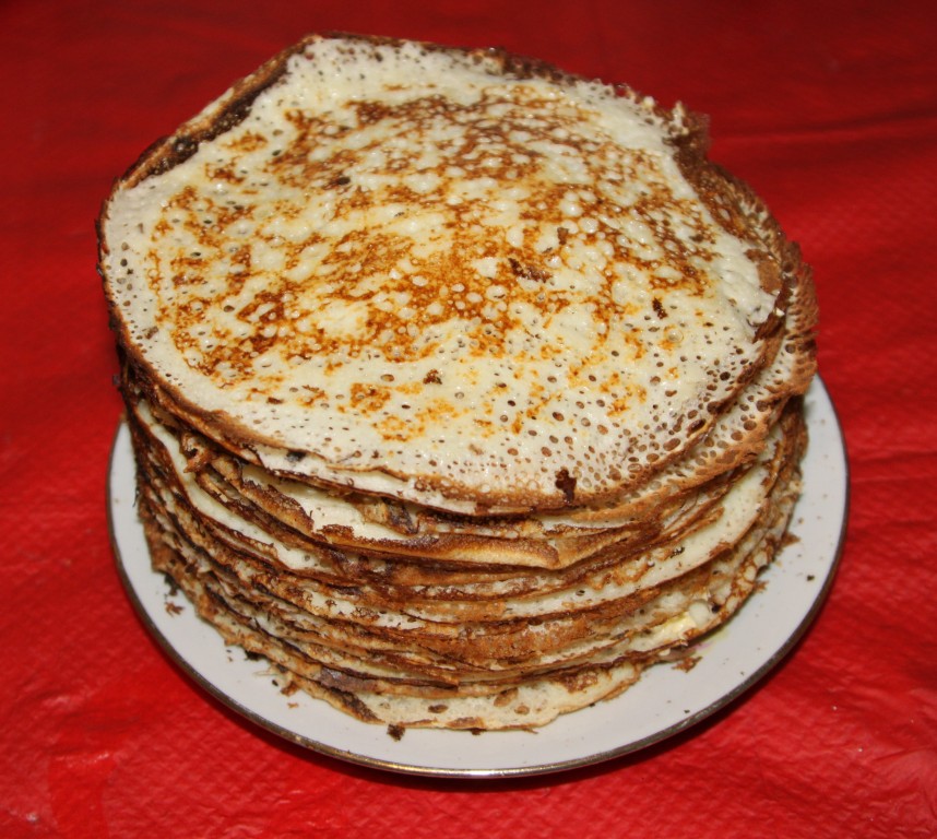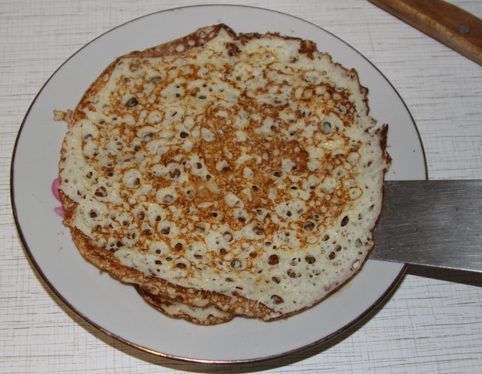 Бабуля, ныне покойная, стряпала необыкновенно вкусные блины, которые позиционировались как традиционные казачьи. Сама она, впрочем, и была, действительно, аутентичная донская казачка, но дело не в том. Процесс производства блинов у меня, по малости лет, внимания не вызвал, я был, скорее, потребителем, но общий смысл таков: выпекаемый блин намазывался сверху яичницей-болтушкой (помню, это было нечто среднее между глазуньей и омлетом, ) и все сворачивалось в трубку. Еще здесь какую-то роль играло куриное крыло. Может быть, кто-то сталкивался с такой разновидностью и напишет подробнее? А я сготовлю тогда.