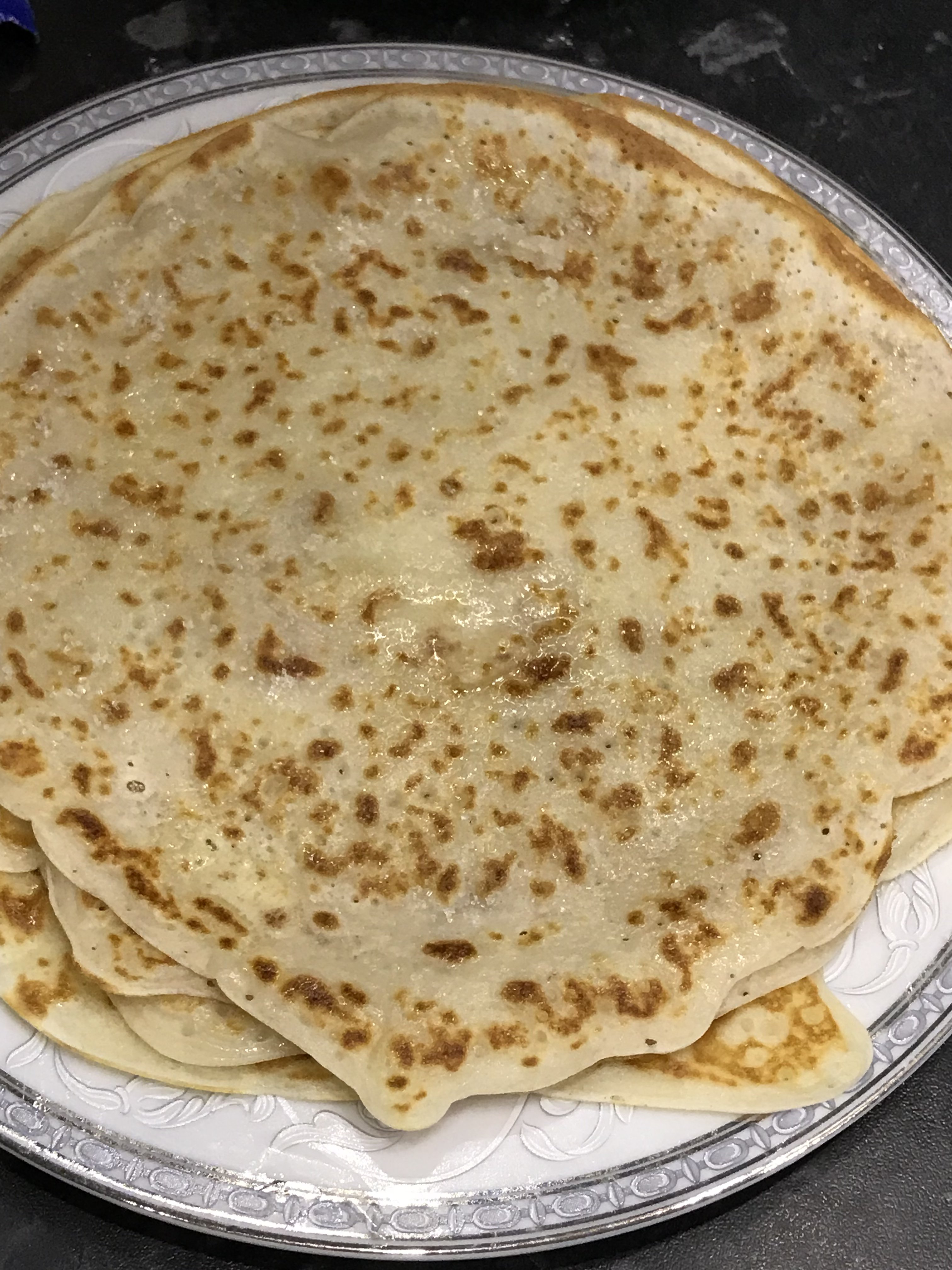 @ToXa, всё девять ешь утром) Блины на кефире без яиц Кефир 250мл Разрыхлитель/сода Соль щепотка Сахар 1ст л Мука 130гр Масло растительное 2ст л Вода кипяток 100мл Смешиваем кефир, муку, разрыхлитель, соль, сахар до однородной консистенции. Вливаем кипяток, замешиваем. Добавляем растительное масло, перемешиваем и оставляем тесто минут на 15. Выпекаем. Смазала сливочным маслом и посыпала сахаром.