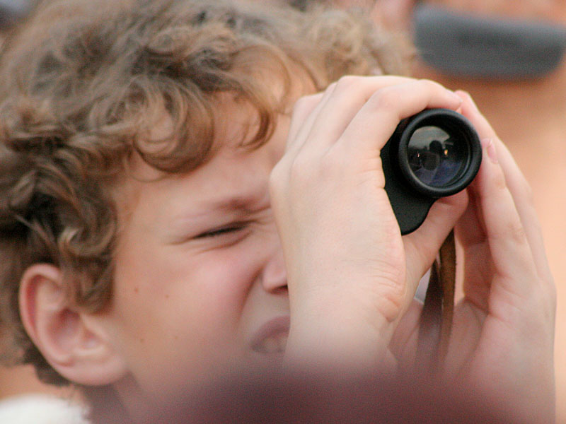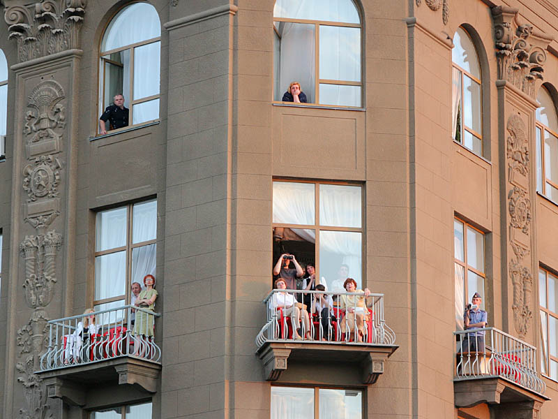 Работники и постояльцы гостиницы "Волгоград" наблюдают за происходящим из окон и с балконов. Применяются сложные оптические приборы