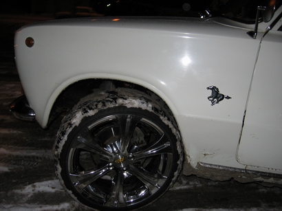 Из внешнего разглядел только колеса, баранку в цвет дисков, правое зеркало и то, что заехал передними колысами на тротуар. Не. На тюнинг не тянет.