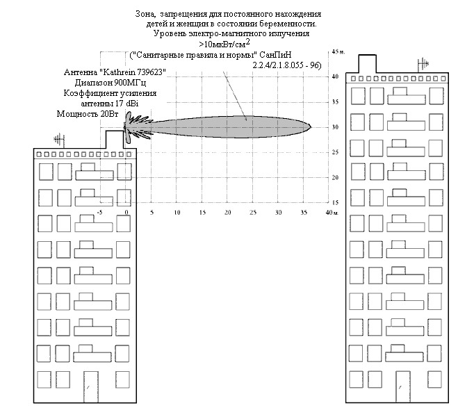Тов. By, наверное, жёлтой прессы начитался. Вот вам картинка для размышления и глубокого обдумывания. Это реальная диаграмма направленности антены Kathrein 739623, диапазон 900MHz, коэфф. усиления 17dBi, мощность 20Вт. Глядя на эту картинку, если б я жил в таком доме, я бы согласился приплатить за то, чтобы антена стояла на моём доме, а не на доме напротив, несмотря на то, что все санитарные нормы для обоих домов соблюдены. Для диапазона 1800 эта зона ещё меньше. Для сравнения, мощность магнетрона микроволновой печи >=600Вт, потери на излучение в окружающую среду >=1%. Вот и считайте что хуже, антена на крыше или микроволновка на кухне.