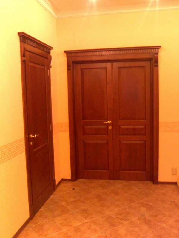 А Вы определитесь, какие двери нужны Дешёвые - пОлые с какой-нить облицовкой из ПВХ\пластика (наподобие тех, что в ванную\санузел) Подешевле - из туфты, облицованные шпоном, имитирующим ценную породу дерева (правда, шпон бывает и действительно настоящим) Средней цены - из цельного массива сосны, предварительно обработанные морилкой для придания нужного цвета и покрытые сверху лаком. Подороже - из цельного массива ценных пород . . . Дорогущие - см.фотку FIRSa Кстати, совет, дверь-стекло-фурнитуру-установку двери лучше делать у одного продавца, ибо "у семи нянек..."