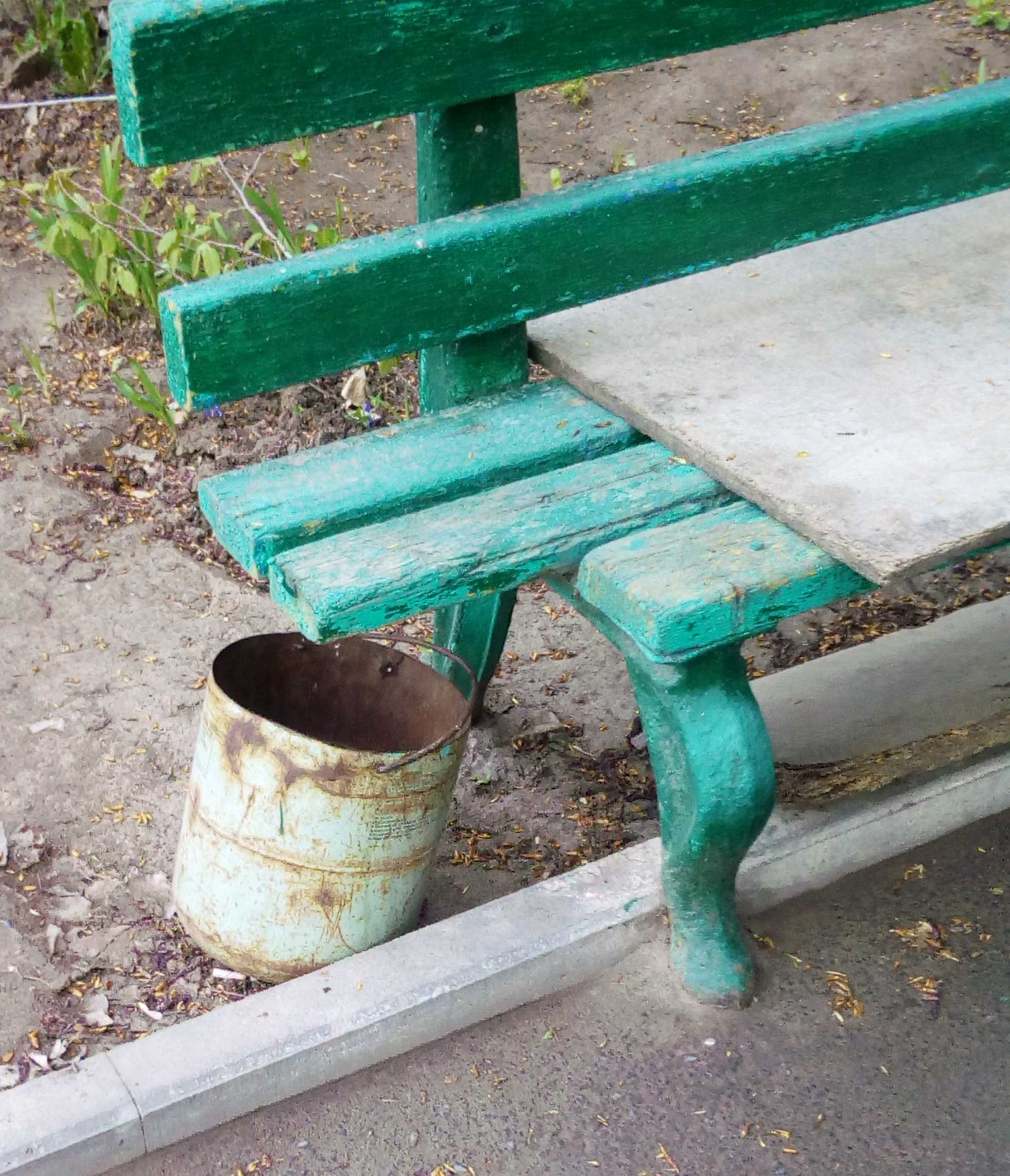 Сцуко, днище. На данный момент установлено 2 урны. Фото безобразия: Зеленая вся уже ржавая внутри. Сгниет за 1 сезон - 100%. Честно говоря тне понятно это б/у урны или самоделка из стоек и б/у ведра из-под краски.