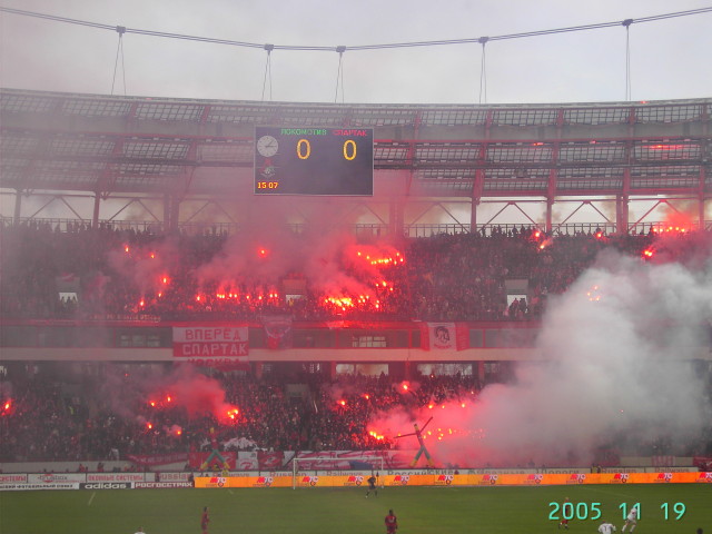 Только со стадио - ажиотаж вокруг матча велик, но организованно все в рамках приличий. Менты корректные, прошел на сектор довольно быстро. (а то некоторые здесь понакупят себе абонементов и думают что им все можно). Довелось мне сидеть на секторе примыкающем к нашему фанатскому северу - все на оч высоком уровне, листочки и флаги на сиденьях для пефоманса, заводилы с мегафонами да и сами люди, тоже..на высоком уровне, пели все абсолютно, причем песен очень много интересных и мастерски исполненных. Просто орать Спартак уже как-то не гламурно. А вот если говорить о визуальной составлющей зрелишности то здесь локо чуть переплюнул, у них и флагов больше, и баннеров плюс всякий нестандарт, типа красно-зеленых полосок на весь сектор. Но слышно их конечно не было - сатдион был на 90% красно-белым. Еще из впечатлений как после фаер шоу поля с нашего сектора вообще минуты три не было видно, ориентировались на звук. По матчу - все заслуженно, но пропускать конечно было не обязательно