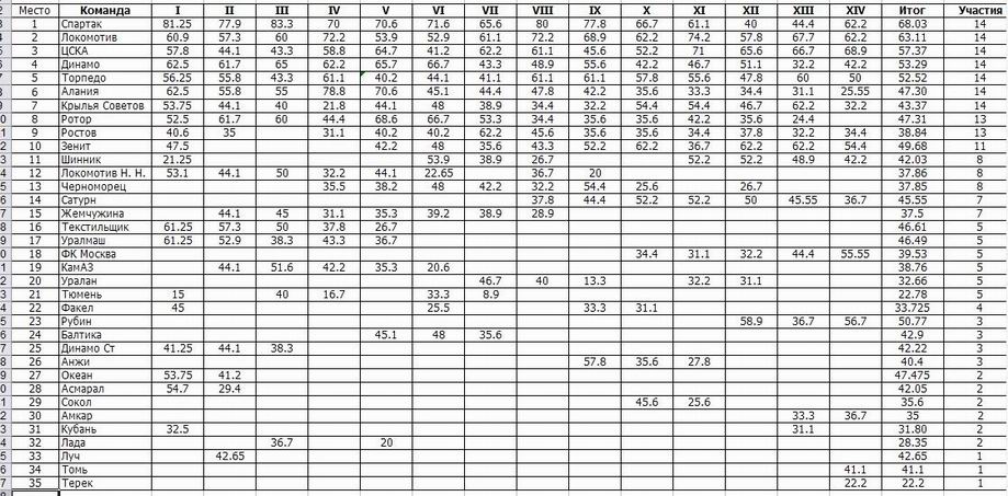 1 Спартак 68.03 14 2 Локомотив 63.11 14 3 ЦСКА 57.37 14 4 Динамо 53.29 14 5 Торпедо 52.52 14 6 Алания 47.30 14 7 Крылья Советов 43.37 14 8 Ротор 47.31 13 9 Ростов 38.84 13 10 Зенит 49.68 11 11 Шинник 42.03 8 12 Локомотив Н. Н. 37.86 8 13 Черноморец 37.85 8 14 Сатурн 45.55 7 15 Жемчужина 37.5 7 16 Текстильщик 46.61 5 17 Уралмаш 46.49 5 18 ФК Москва 39.53 5 19 КамАЗ 38.76 5 20 Уралан 32.66 5 21 Тюмень 22.78 5 22 Факел 33.725 4 23 Рубин 50.77 3 24 Балтика 42.9 3 25 Динамо Ст 42.22 3 26 Анжи 40.4 3 27 Океан 47.475 2 28 Асмарал 42.05 2 29 Сокол 35.6 2 30 Амкар 35 2 31 Кубань 31.80 2 32 Лада 28.35 2 33 Луч 42.65 1 34 Томь 41.1 1 35 Терек 22.2 1 Вот составил таблицу. В 14 чемпионатах России прияняло участие 35 команд, которые я упорядочил следующим образом. Во-первых, выше та команда, отыгравшая наибольшее число сезонов (последняя цифра в таблице). Во-вторых, при равном количестве проведенных сезонов высчитывается процент эффективности - процент набранных очков от максимально возможного. Это позволяет связать сезоны, когда с 3-хочковой системой за победу с ранними сезонами, включая самый первый, когда команды были разбиты на 2 группы по географическому принципу. Безусловный лидер - Спартак, он набрал более 68% очков. Рекорд принадлежит ему же - в 3 чемпионате он набрал 83.3% очков. Наихудший сезон провел ФК Тюмень в 7 чемпионате - всего 8.9% набранных очков. Ротор спустился на 8 строчку, пропустив крылышек за счет меньшего числа чемпионатов, хотя очков набрал больше - 47% против 43% у самарцев.