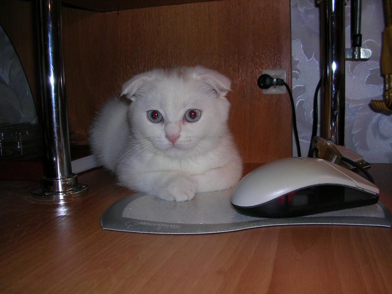 Правильно говорят. А еще тут тонкий вопрос. У скотишей, имеющих гены фолдов, в месяц важно не ошибиться в ушах. У нас так и произошло. Кошка записана как SFS (Scottish Fold Shorthair), она и была фолдом, но потом уши встали и мы лишились CAC... Обидно, даже судьи расстроились - все признаки в идеале... Если бы она была записана страйтом - была бы чемпионом 100%. Сказали, ну что ж, рожайте чемпионов! a-res, а что у тебя за кот? Раскажи, мож и договоримся! В@дим, спасибо, белые голубоглазые - это редкость. Родоначальница Скотишей была именно такой.