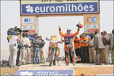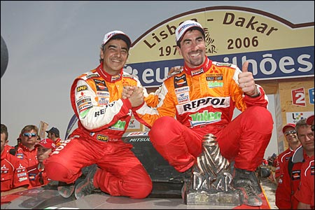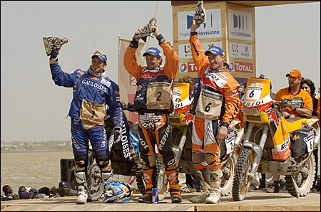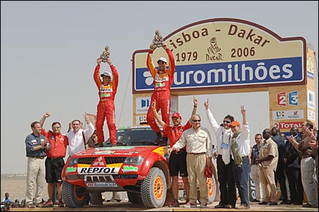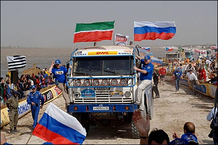 Владимир ЧАГИН: "МЫ НЕ ИМЕЛИ ПРАВА ОШИБАТЬСЯ!" Как уже сообщал "СЭ", "Дакар"-2006 завершился очередной, уже пятой по счету победой российского экипажа "КамАЗа" в составе Владимира Чагина, Семена Якубова и Сергея Савостина. Кстати, в этом году они отметили 10-летний юбилей своего спортивного содружества. НОВЫЙ РЕКОРД Сколько раз читала о том, что Розовое озеро в столице Сенегала Дакаре действительно розовое. По поводу причины столь необычного для воды цвета источники расходятся. По одной версии, такой оттенок ей придает глинозем. По другой - все дело в некой галофитной бактерии, вырабатывающей розовый пигмент. Причем вода в озере настолько соленая, что никакое живое существо, кроме этой самой бактерии, там не выживет. На протяжении всего года, за исключением дня "дакаровского" финиша, на озере ведут добычу соли самым простым из известных способов: стоя по горло в воде, черпают ее кристаллы со дна и перегружают в лодки. 15 января Розовое озеро не было розовым... То ли вместе с солью вычерпали весь глинозем, то ли соленая вода все-таки убила все живое, включая галофитную бактерию. Но недостаток розового цвета компенсировался обилием сине-голубого. Болельщики "КамАЗ-Мастер" раскрасили этими фирменными цветами команды весь финишный городок. А когда пришла очередь въехать на пьедестал "КамАЗа" Владимира Чагина, Семена Якубова и Сергея Савостина, синие майки окончательно затмили все и вся. Вечером "КамАЗ-Мастер" отмечала в ресторане "Терру Би" свою в общей сложности седьмую победу на "Дакаре". В этом году наша команда стала не просто в очередной раз лауреатом легендарной гонки, но и одним из ее рекордсменов. До 2006-го по количеству побед лидировала "Татра", завоевавшая шесть главных призов, теперь впереди всех "КамАЗ". ПЕСОК КАК МУКА - Каждый "Дакар" чем-то отличается от предыдущих гонок. В этом году скажем, старт был дан не 1 января, как обычно, а 31 декабря. Получается, что Новый год мы встречали уже в роли участников марафона, были, так сказать, на работе, - начал разговор Чагин. - Очень понравились этапы по Португалии. Раньше "Дакар" начинался с маленьких спецучастков по 4 - 5 км, а теперь организаторы сделали два по 100 км. Это были настоящие, полновесные этапы, и европейцы смогли увидеть настоящий "Дакар". Публики, надо сказать, было очень много - мы ехали в сплошном людском коридоре. Представляете, рано утром 1 января люди пришли, чтобы постоять на обочине дороги и посмотреть на машины! Причем народ собрался смелый: никто ни на шаг не отступал, когда мимо проносился наш грузовик. Мне самому временами было страшновато, а им, похоже, нет. Вообще, считаю, организаторы в этом году хорошо продумали всю гонку. Пик сложности пришелся на день перед и день после выходного. Такой трудный момент фактически был всего один за весь марафон. Весь ралли-рейд можно разделить на три части: скоростное начало по Африке, труднейшие этапы в районе дня отдыха и финальный "зеленый ад" по Гвинее. Жесткая середина гонки оказалась непростой и для нашего, казалось бы, уже ко всему привычному экипажа. Так как мы ехали в лидирующей группе, перед нами не было накатанной трассы, нужно было самим прокладывать дорогу в дюнах. И на перегоне Зуэрат - Атар, и на пути из Атара в Нуакшот мы застревали. Причем застревали не на участках, указанных в "дорожной книге", а когда искали проход в дюнах. Мавританский пе