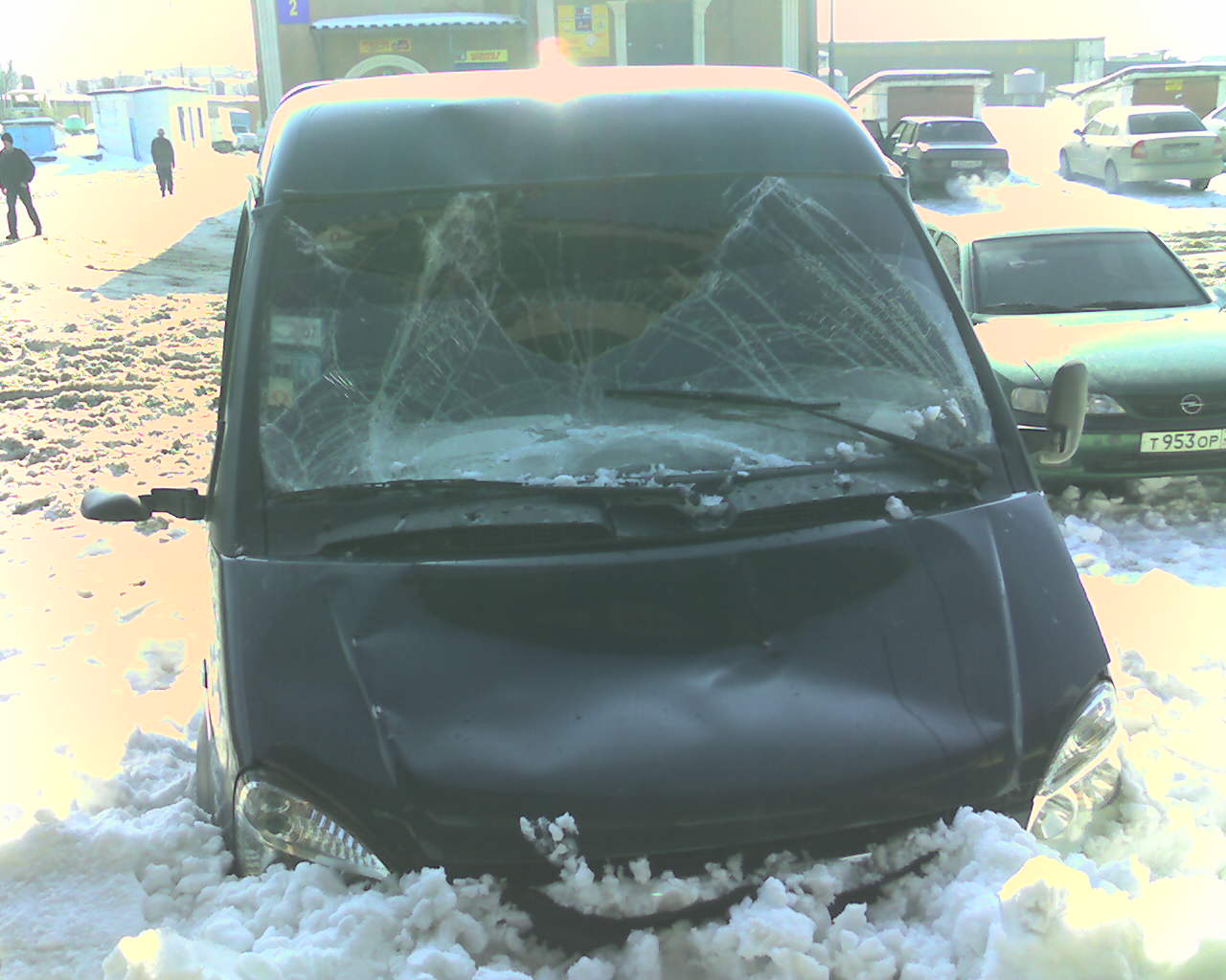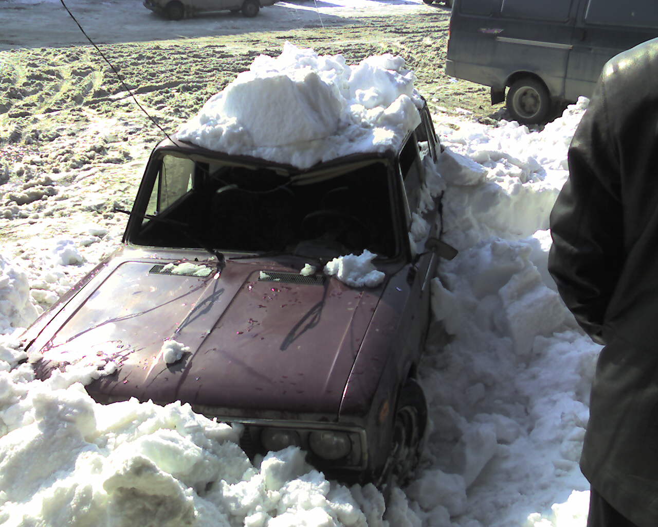 Мораль: надо думать, куда ставишь машину. Вполне нормально, что в весеннюю оттепель с крыш падает снег.