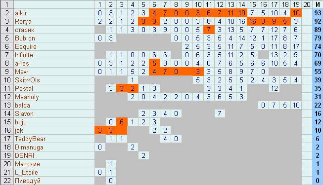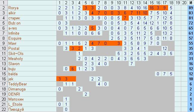 поправочка у старика ещё +2 очка таким образом он догнал alkir'a в борьбе за второе место Rorya - 89 alkir - 83 старик - 83
