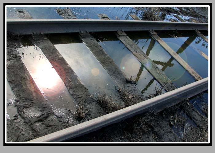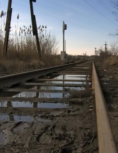 Сказка "Три пятачковых". Народ, с таким пристрастием к лужам у нас скоро вырастут пятачки и копытца! То ли у меня моник домашний настолько грустный, то ли у тебя всё-таки темноватая фотка. Сделать бы акцент на грязи, что в правом нижнем углу кадра... И я бы камеру, наверное, чуть вправо и вниз повела - так, чтобы рельсы стремились к точке золотого сечения... Впрочем, к моим фоткам куда больше претензий по композиции. %) Меня сейчас, кстати, мысль посетила: может быть, было бы лучше отойти чуть (или не чуть) назад и построить композицию так, чтобы этот деревянный столб-циркуль попадал в кадр целиком?.. А что-нибудь ещё из пленэрных фоток выкладывать будешь?