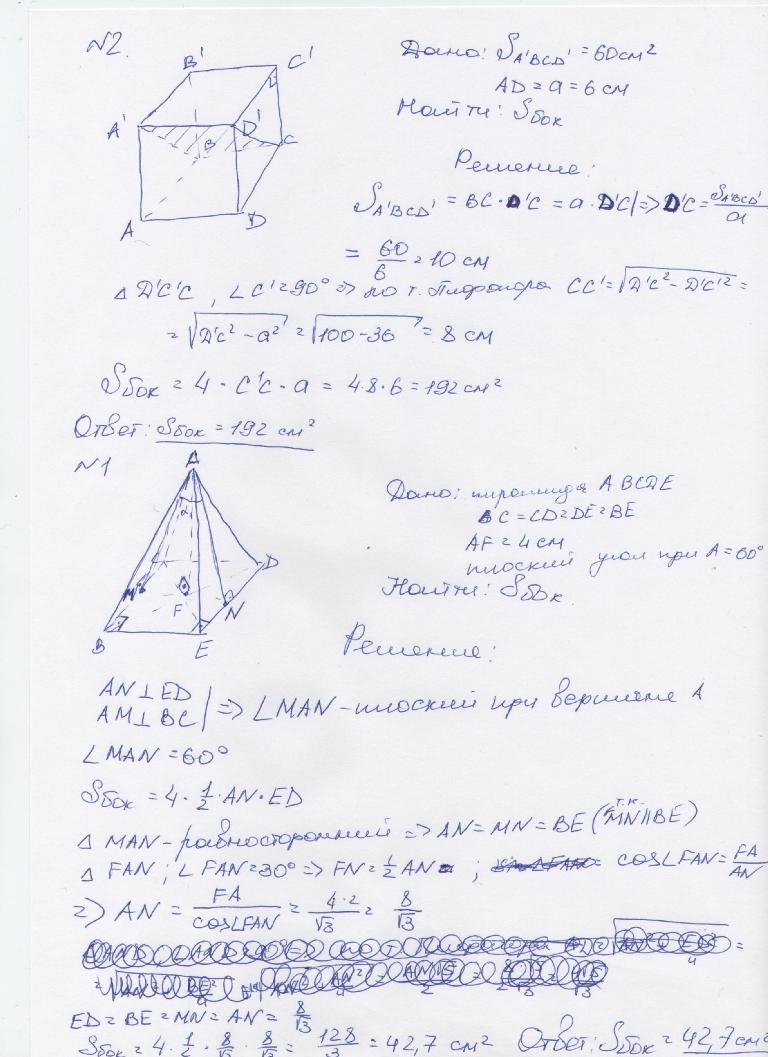Хоть каникулы, но ОЧЕНЬ нужно ДО 8 УТРА Тут усть одна поблема задачки хоть и лёгкие(так сказала сестра) А курс 10 класс я не помню Так вот: задачки на тему многогранники, а именно призма и пирамида 1-В правильной четырёхугольной пирамиде высота равна 4 см. плоский угол при вершине равен 60* Найти Sбок поверхности призмы 2-правильная четырёхугольная призма пересечена плоскостью, которая содержит 2 диагонали. Площадь полученного сечения равна 60 см, а сторона основания равна 6 см, найти Sбок поверхности призмы