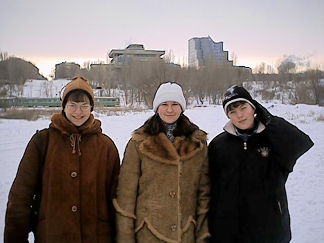 Хе-хе. Мужики оказались на редкость занятыми. Пришлось мне одному за всех. Значит так: гуляю я это возле "многострадальной гостницы", что на берегу Царицы никак не достроят. Гуляю, это я, гуляю. Уже подумываю и уходить, поскольку "большинство" людей уже отзвонилось, хе-хе. И вдруг ещё один звонок! По наитию я посмотрел направо и увидел трёх девушек с "выискивающим" взглядом. Это Галка пришла с двумя подружками.