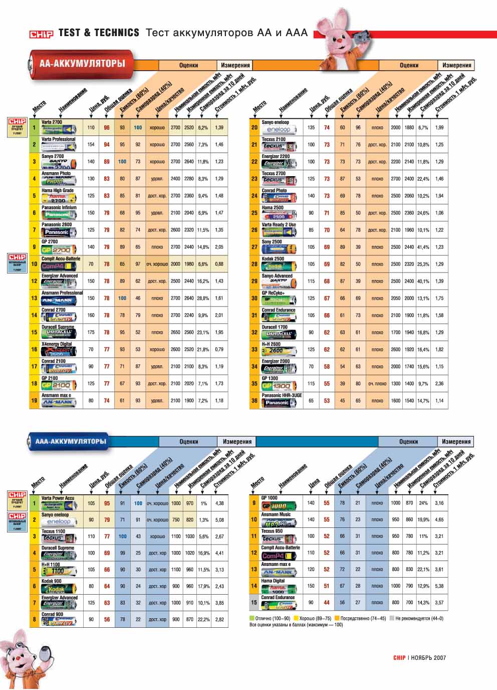 На форуме iXbt есть тема про аккумуляторы в 5200 постов. Я ее прочитал вcю. Резюмирую: самый крутой зарядник LaCrosse (он же TechnoLine) BC 900 (или BC 700) - меряет напряжение, реальную емкость, можно померять внутреннее сопротивление, есть режимы разряда, тестирования емкости, refresh до набора максимальной емкости, регулируется ток заряда, очень четко определяет момент окончания заряда даже на слабых токах. Я себе такую штуку (BC700) купил в Москве, 1400 руб. Подтверждаю все сказанное, классная весчь! Самые путевые аккумуляторы - те, которые сделаны по специальной технологии и имеют низкий уровень саморазряда. Я купил Sanyo Eneloop 2000. Почувствуйте разницу: Varta Photo 2300 через месяц после зарядки фотик вообще не включается, Eneloopы через три месяца - как будто только из зярядки вытащил, отщелкали всю норму. Реальная емкость у них одинаковая, 1800-1900 mAh. Вообще, 2000 mAh - реальный предел технологии, все что выше - это дутые цифры, новые 2500 mAh Varta дают в реале 1900-2100, максимум что видел - 2300, и у всех аккумуляторов большой емкости очень быстрый саморязряд и высокое внутреннее сопротивление. которое очень быстро увеличивается со временем. А это важно для сильноточных устройств (на токе в 2 А они просядут так, что фотоаппарат просто вырубится) - емкость есть, только использовать ее не получится. Сравните: Varta Photo 2300 купил два года назад (прошли 30-40 циклов) - сопротивление 0,4 Ом - фотоаппарат вообще не включается, Saft 1200 (6 лет назад купил Dect телефон, они там стояли) - прошли 1000 циклов сопротивление 0,2 Ом - можно нормально фотографировать. По остальным примерно такая же статистика - чем меньше емкость тем дольше работает.